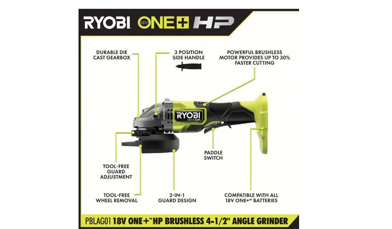 Ryobi One+ HP 18V Brushless Cordless 4-1/2 in. Angle Grinder (Tool Only) PBLAG01B