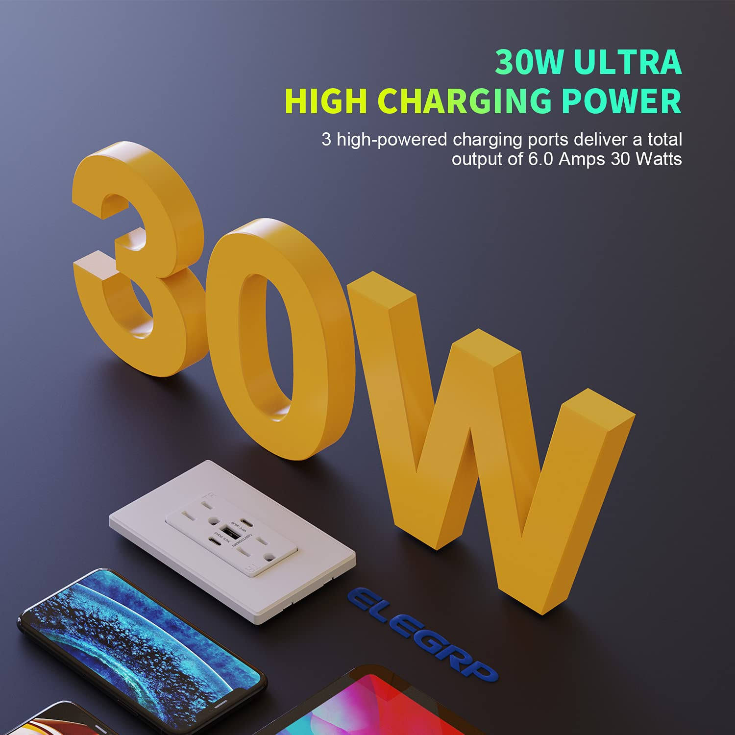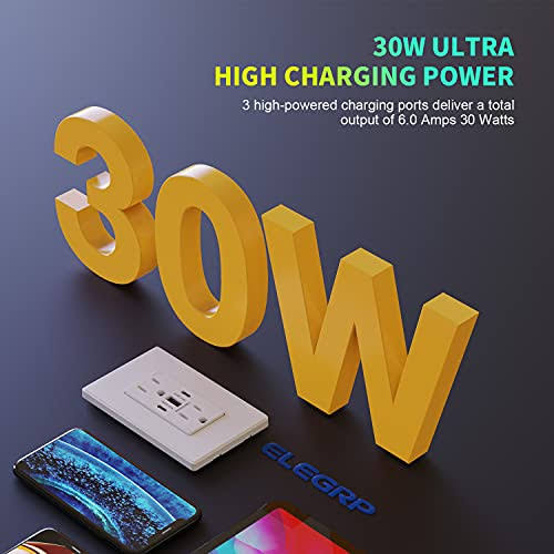 ELEGRP USB Outlets Receptacles, 3-Port USB C Wall Outlet, 30W 6.0A USB Electrical Outlet, 20 Amp Tamper-Resistant Outlet with US, White