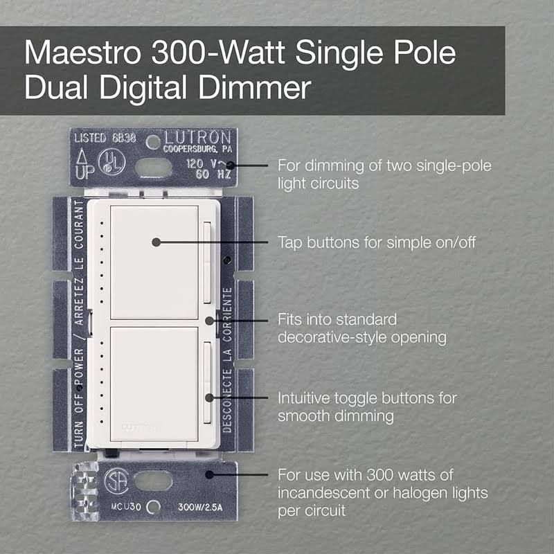 Lutron MA-L3L3-WH Maestro Dual Dimmer 300W Single Pole White