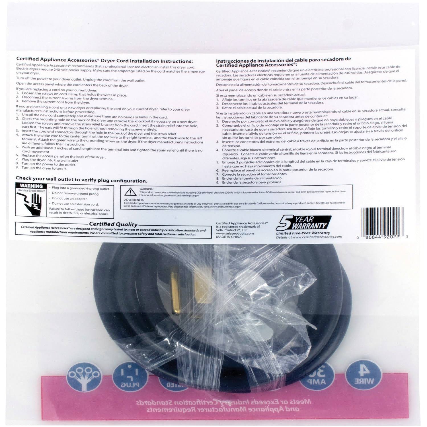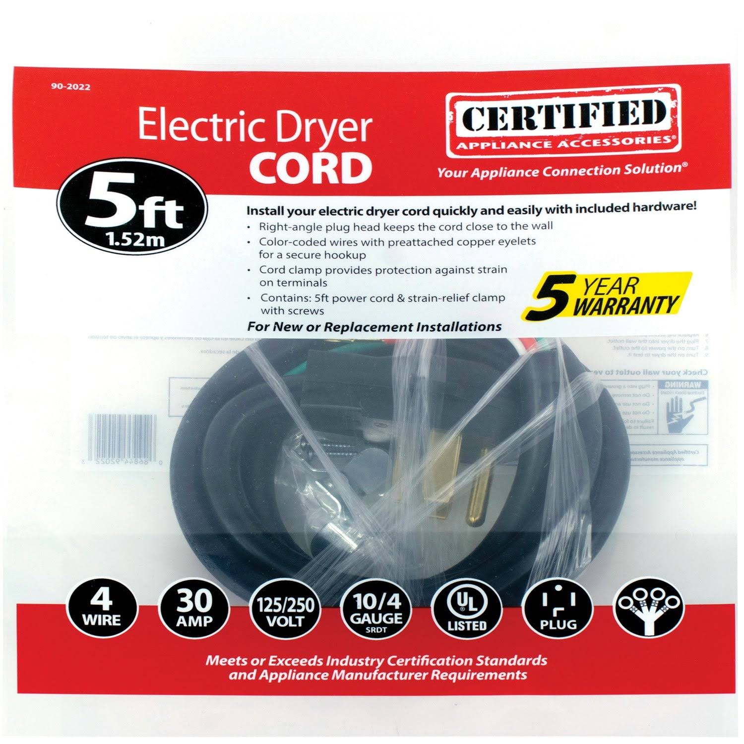 Certified Appliance 90-2022 4-Wire 30 Amp Dryer Cord (5 ft)