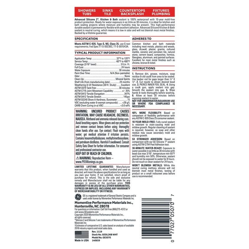 GE Advanced Silicone 2 Kitchen & Bath Sealant- White- 10.1 oz