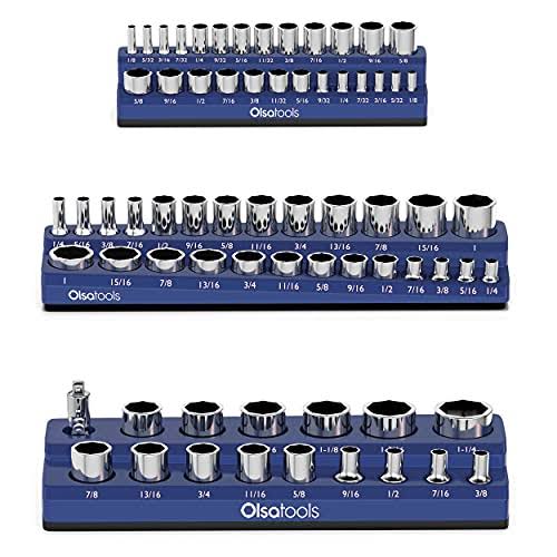 Olsa Tools Magnetic Socket Organizer | 3 Piece Socket Holder Kit | 1/2-Inch 3/8-Inch 1/4-Inch Drive | Metric Blue | Holds 75 S