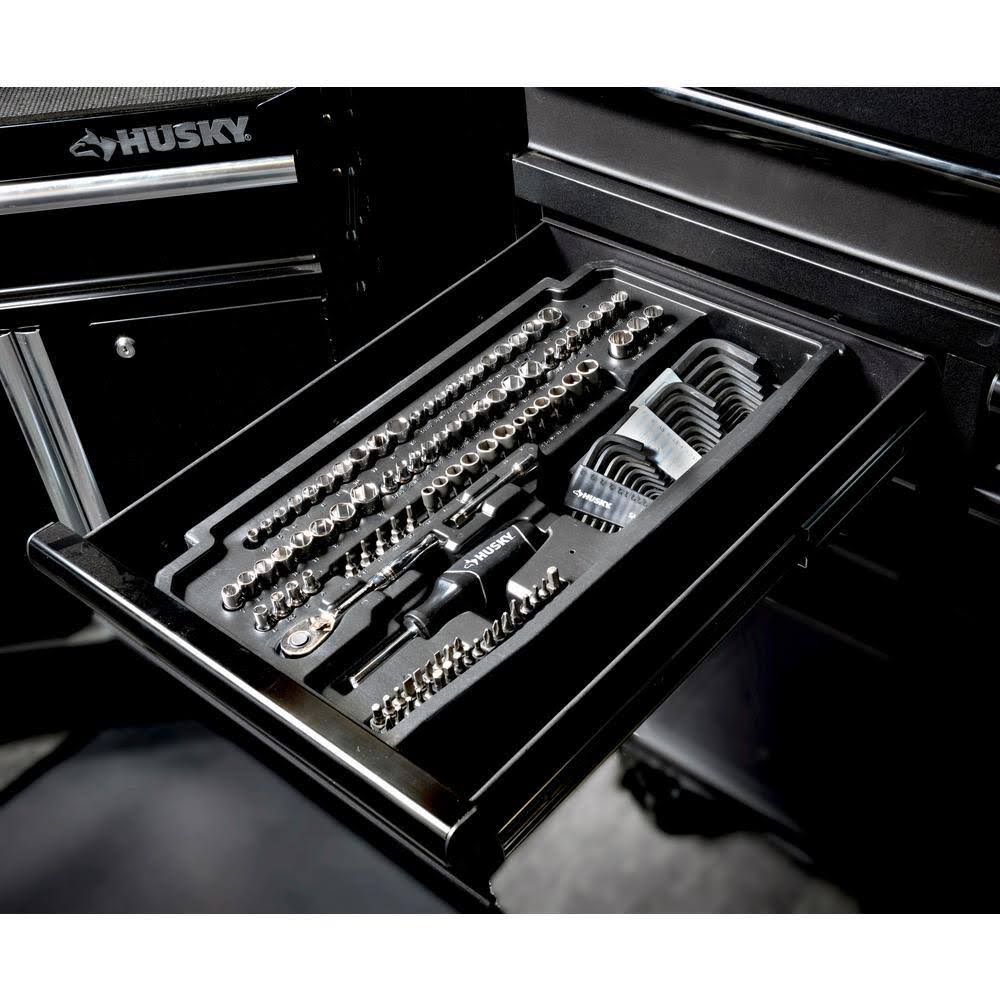 Husky 41 in. W x 24.5 in D Standard Duty 16-Drawer Combination Rolling Tool Chest and Top Tool Cabinet Set in Gloss Black