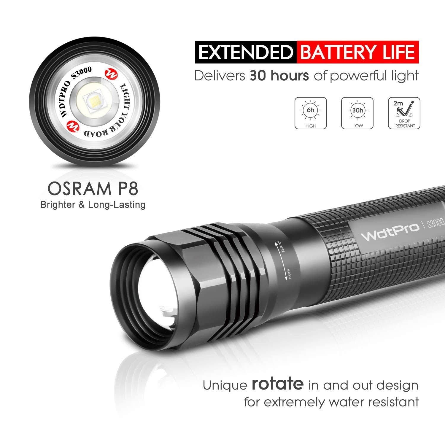WdtPro High-Powered LED Flashlight S3000, Super Bright Flashlights- High Lumen, IP67 Water Resistant, 3 Modes and Zoomable for Camping, Emergency,