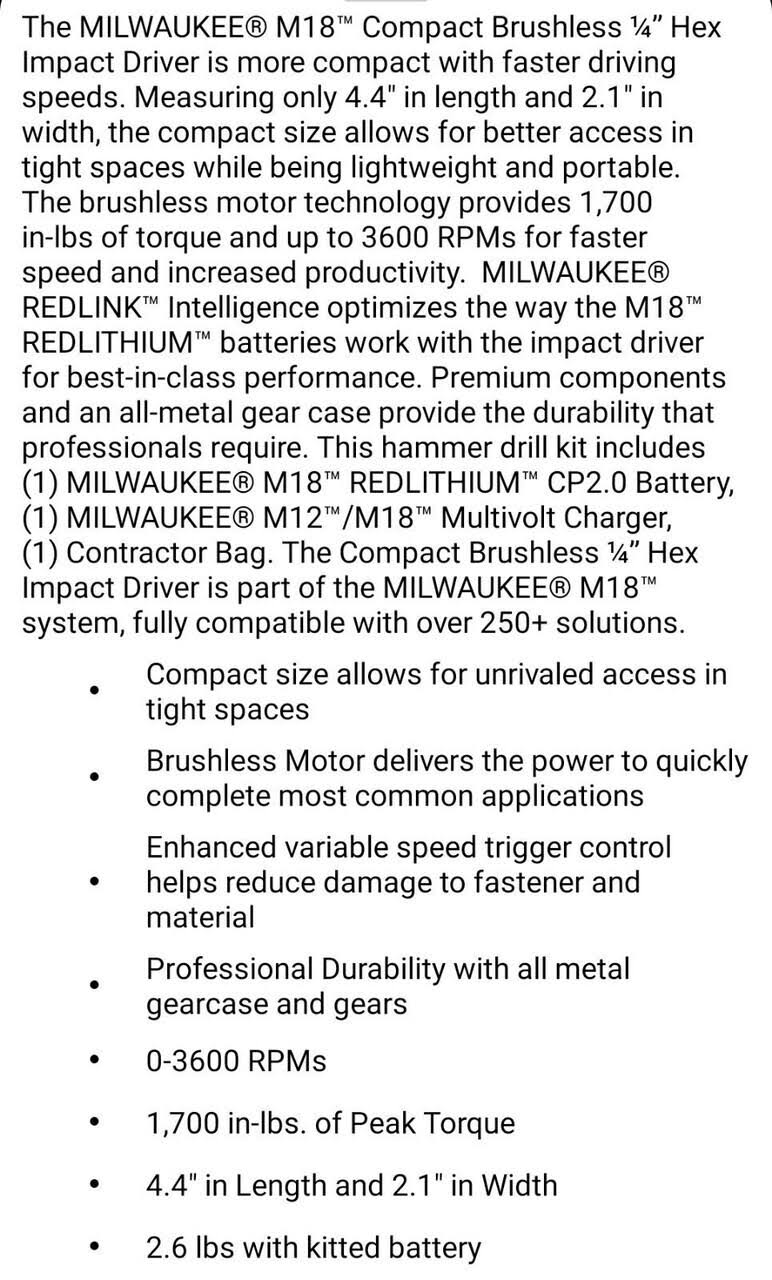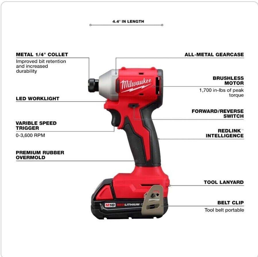 Milwaukee 3650-21P M18 Compact Brushless 1/4" Hex Impact Driver Kit
