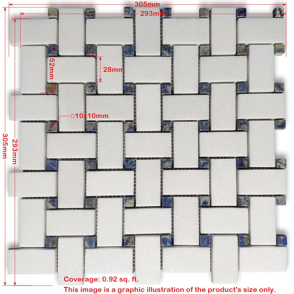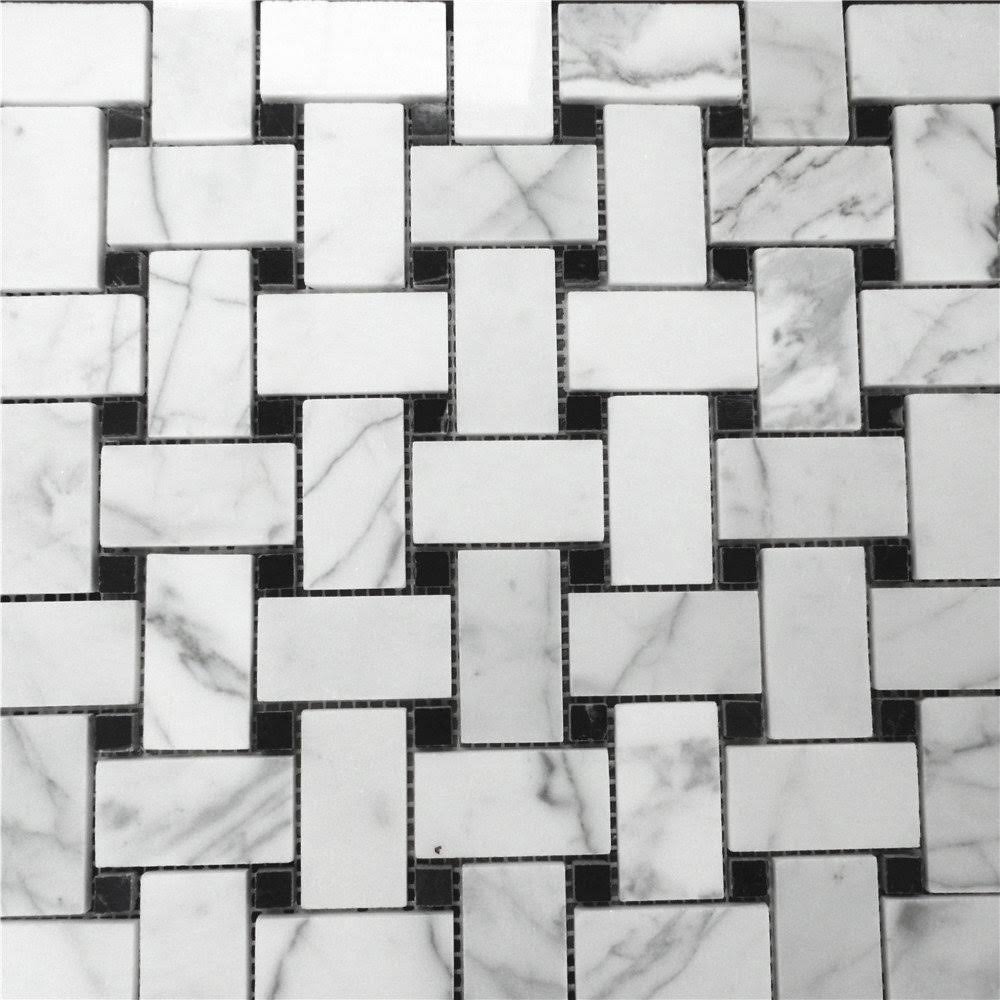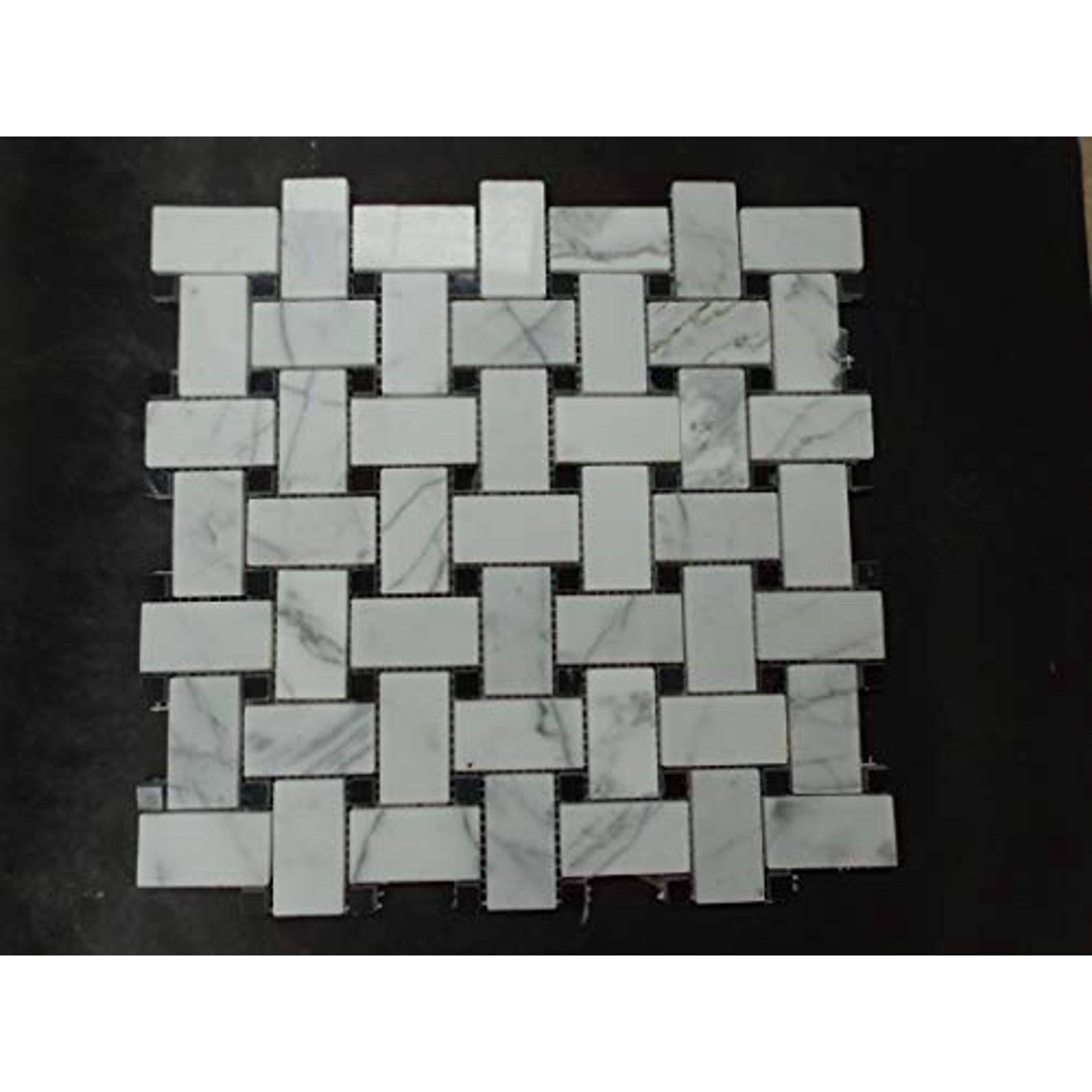 Stone Center Online Carrara White Marble 1x2 Basketweave Mosaic Tile w/Nero Marquina Black Dots Polished Kitchen Bath Wall Floor