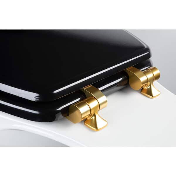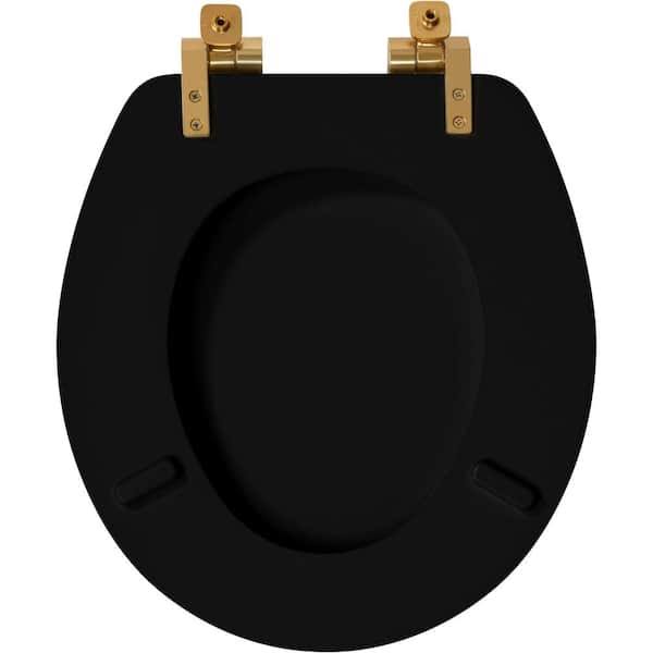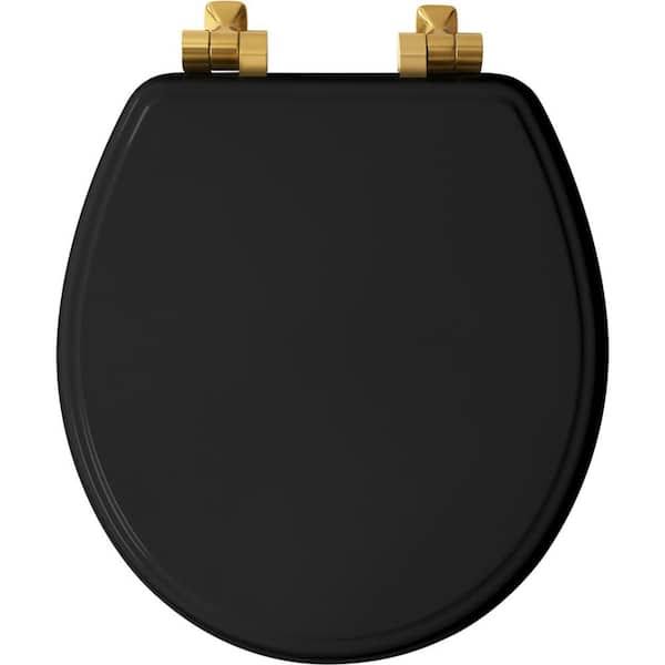 Bemis Weston Soft Close Round Enameled Wood Closed Front Toilet Seat in Black Never Loosens Brushed Gold Hinge
