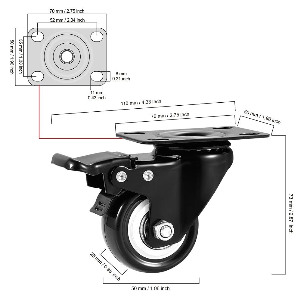 CLOATFET Caster Wheels, 2" Casters with BRAKE, No Noise Swivel Casters with Set of 4, Polyurethane (PU) Wheels with Locking, 4 Pack Castors, Heavy