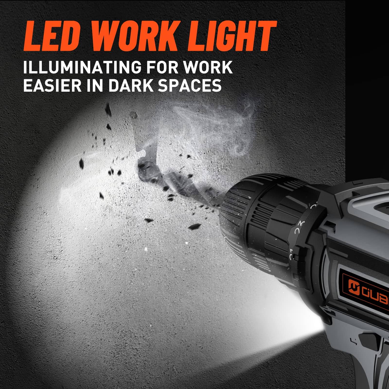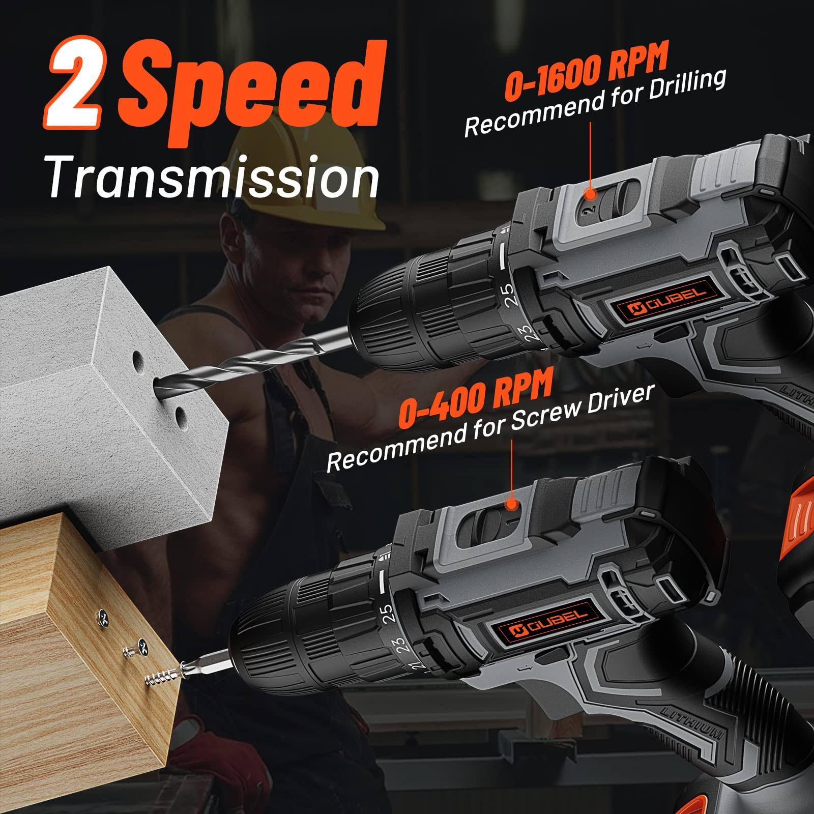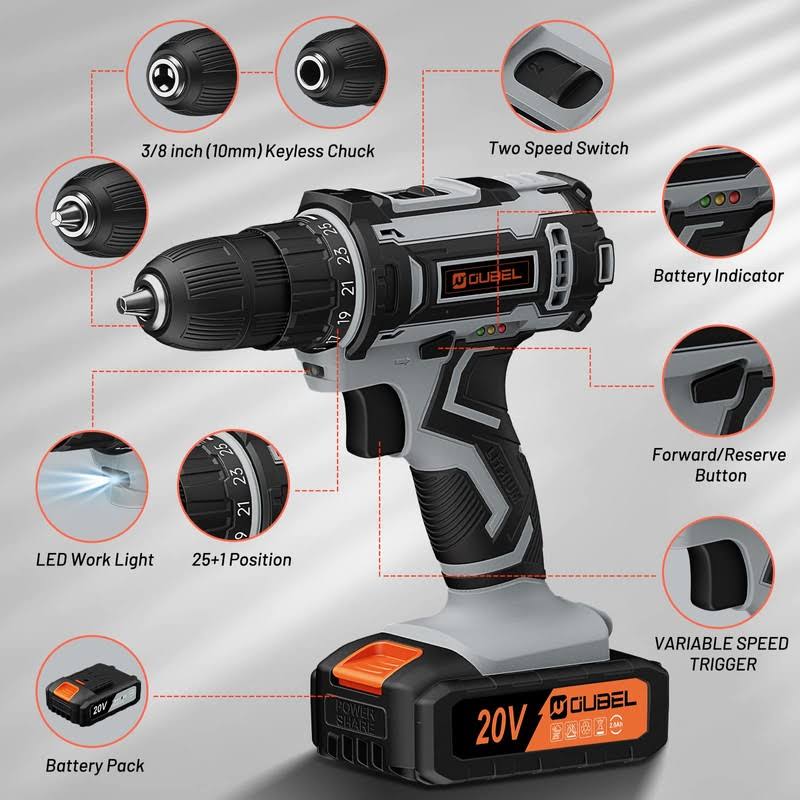 Drill Set, OUBEL 20V Cordless Drill with Battery and Charger, Home Electric Power Drill Cordless, 3/8-Inch Keyless Chuck, 2 Variable Speed, 25+1