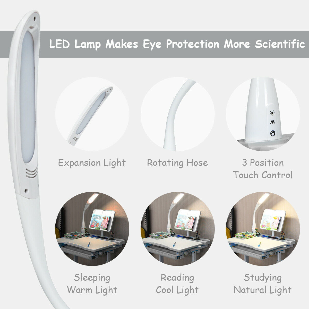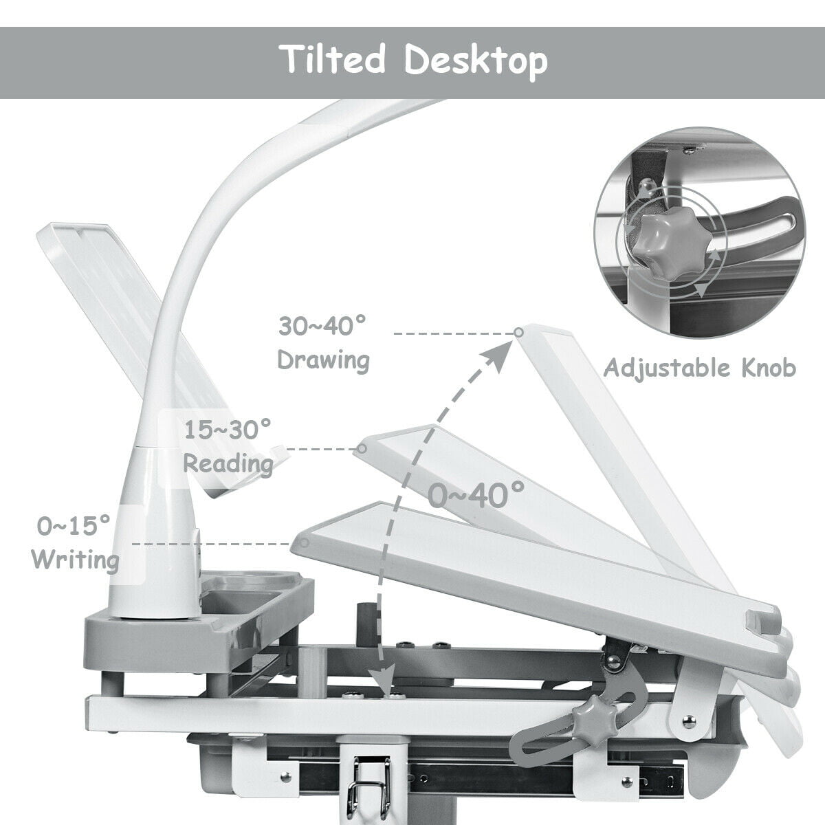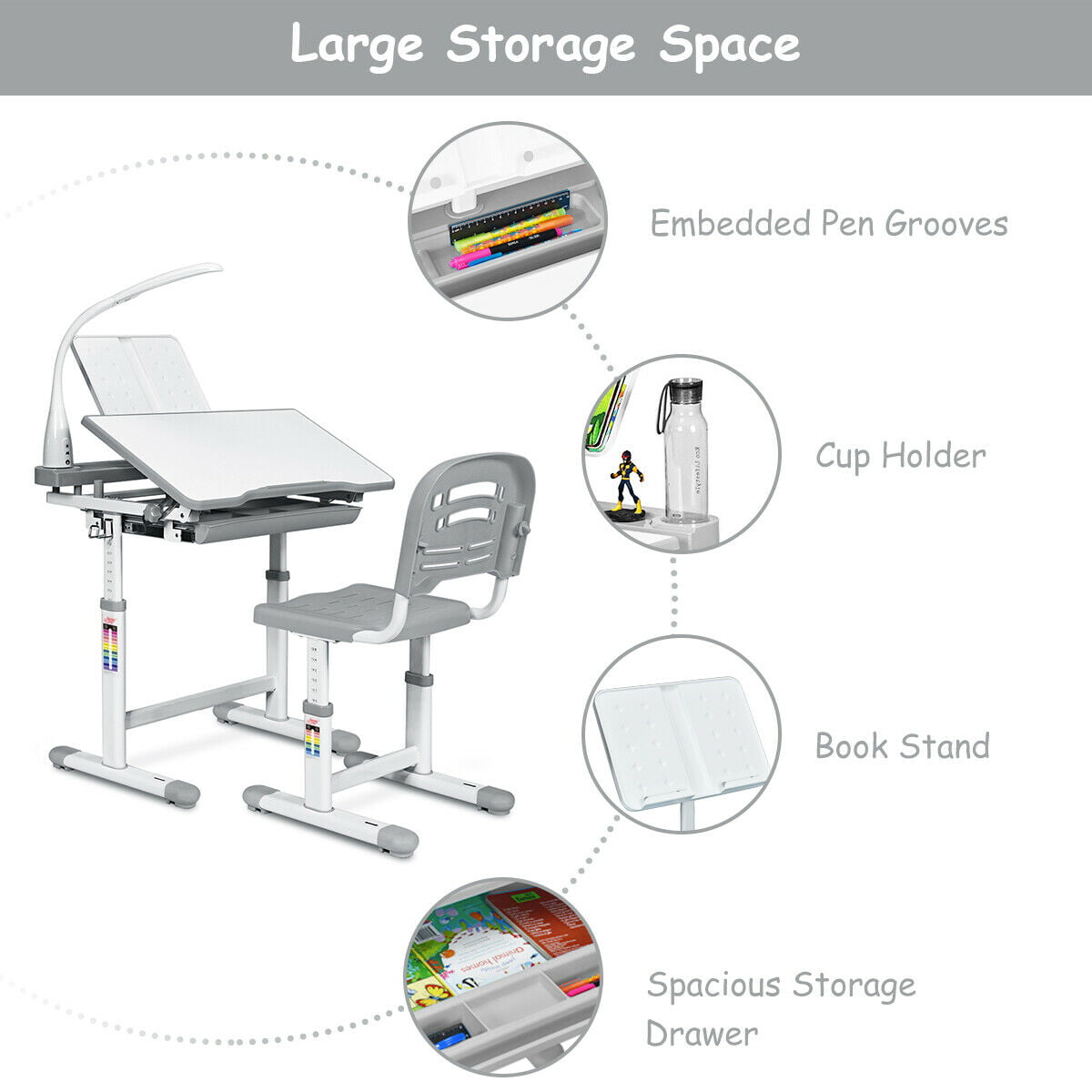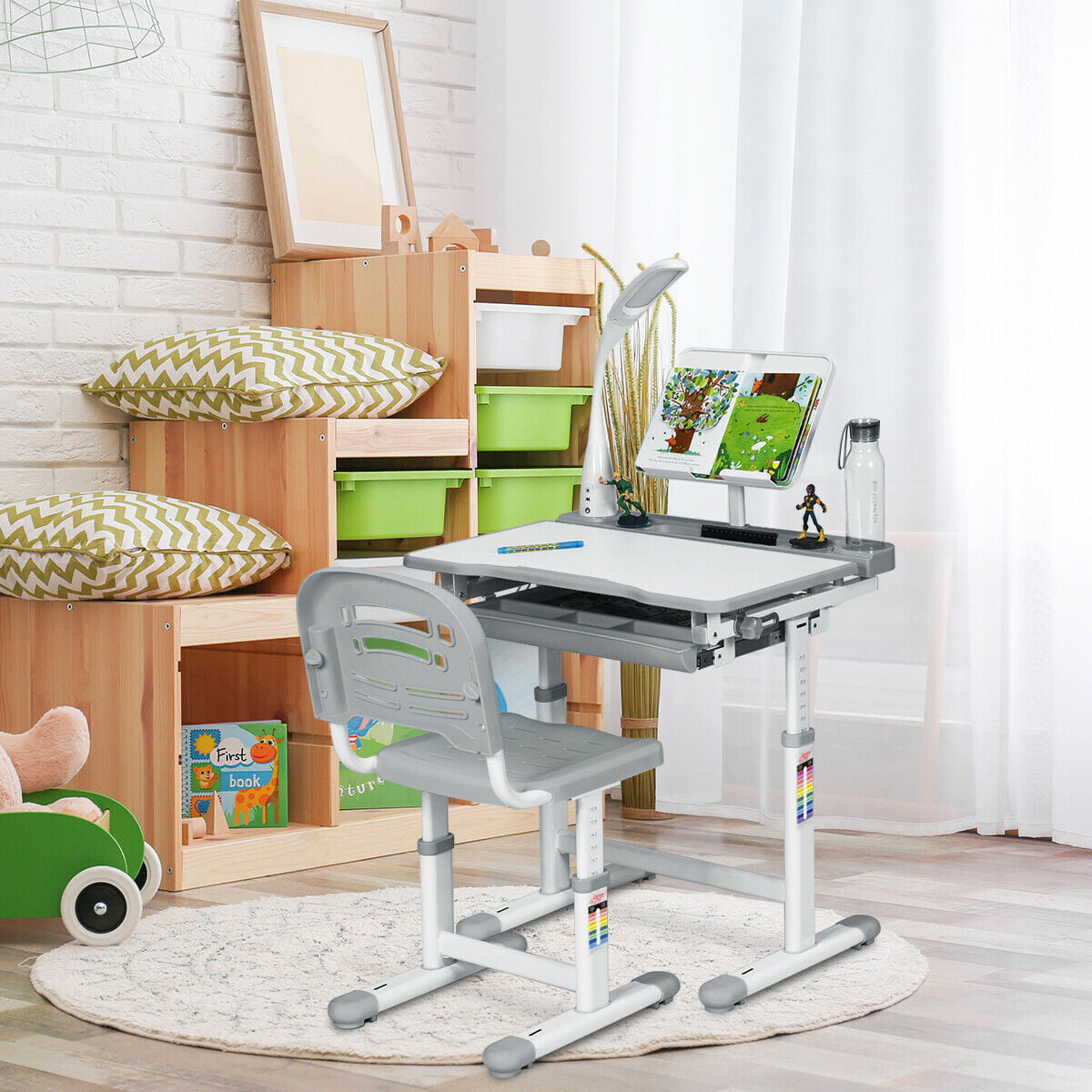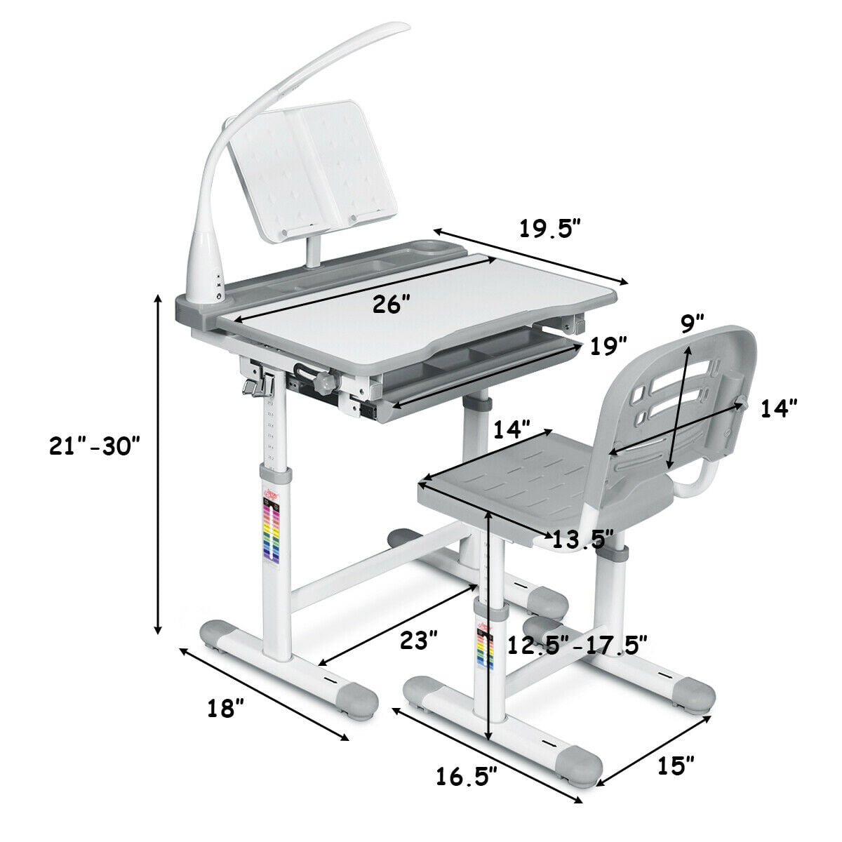 Gymax Height Adjustable Kids Desk Chair Set Study Drawing w/Lamp & Bookstand Gray