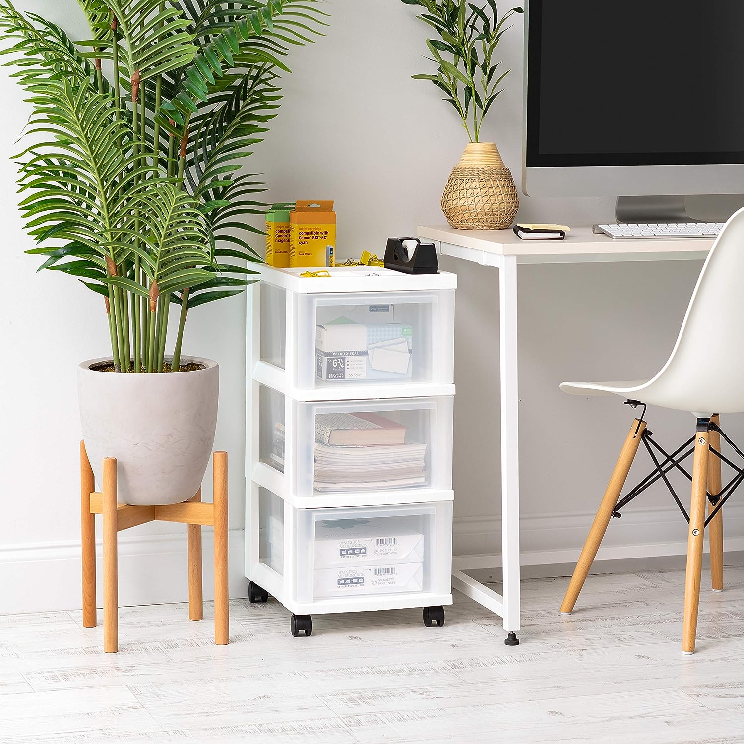 IRIS USA 3-Drawer Storage Cart with Organizer Top with Wheels. Plastic. White