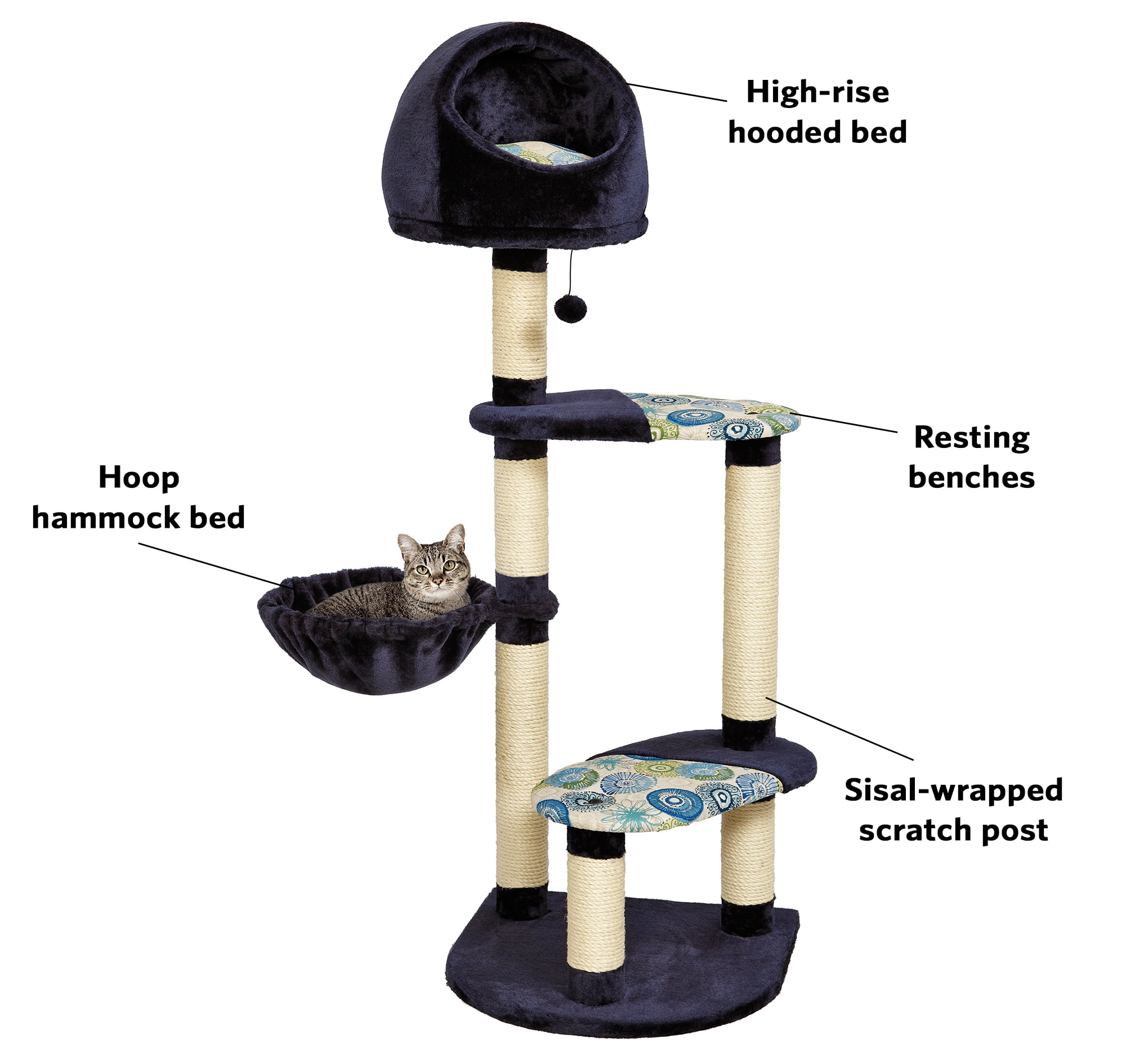 Cat Tree | “Resort” Cat Tree / Cat Furniture. 4-Tier Cat Tree w/ Sisal Wrapped Cat Scratching Support Posts. Hanging Cat Bunker Bed & High Canopy Cat Perch. Blue / White Pattern. Large Cat Tree