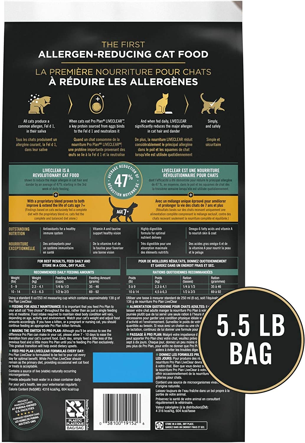 Purina Pro Plan Allergen Reducing Senior Dry Cat Food LIVECLEAR Adult 7+ Prime Plus Chicken and Rice Formula 5.5 lb. Bag