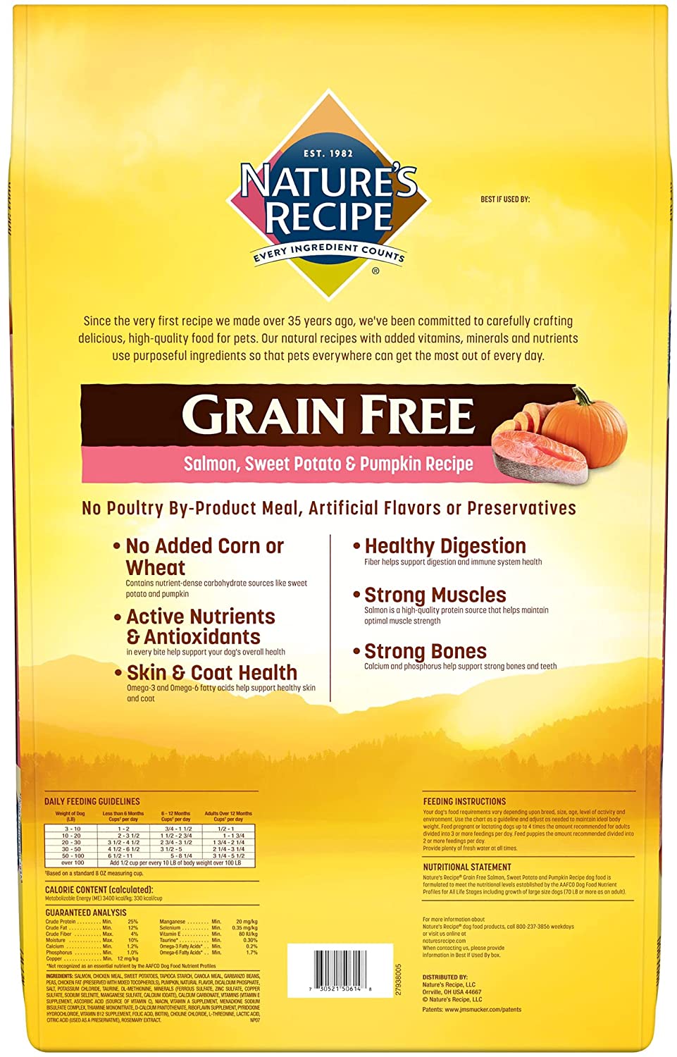 Nature-s Recipe Grain Free Dry Dog Food. Salmon. Sweet Potato & Pumpkin Recipe. 12 Pound Bag. Easy to Digest