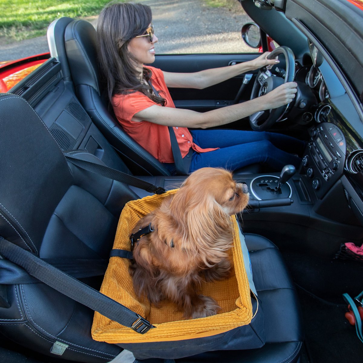Kurgo Skybox Booster Seat - Pet Car Seats for Small Dogs and Puppies Weighing Under 30 lbs - Headrest Mounted - Dog Car Seat Belt Tether Included - Rover and Skybox Styles ( Black/Orange)