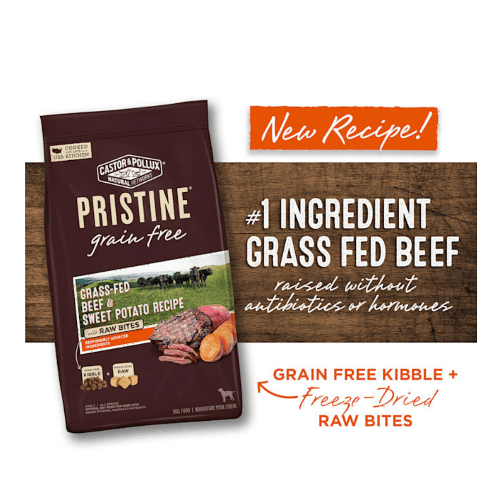 Castor & Pollux Pristine Grain Free Grass-Fed Beef and Sweet Potato Recipe with Raw Bites Dry Dog Food. 18 Pounds
