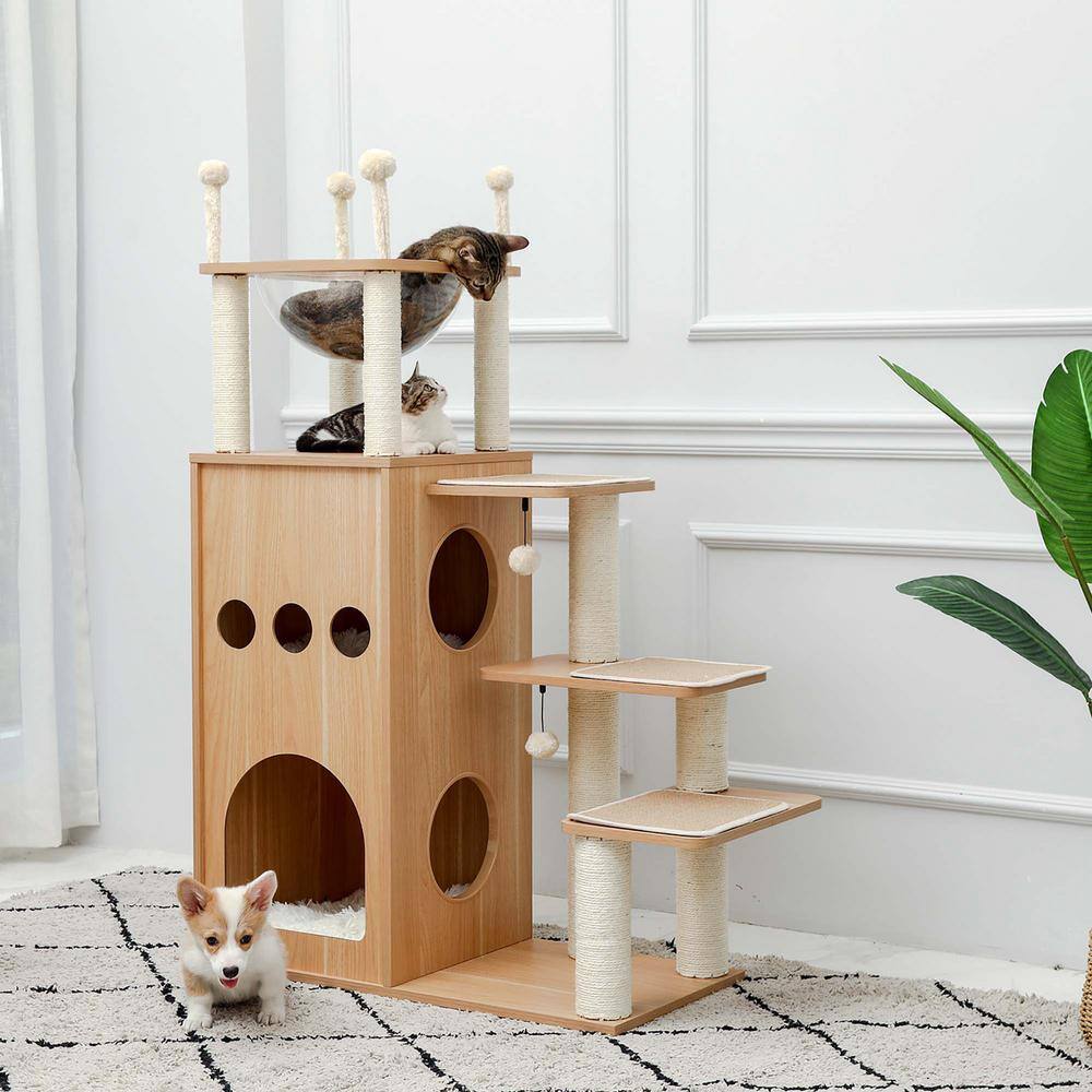 PawHut D30-517V01 Natural Wood Color Small/Medium Cat Wooden Cat Exercise Wheel Treadmill Cat Tree