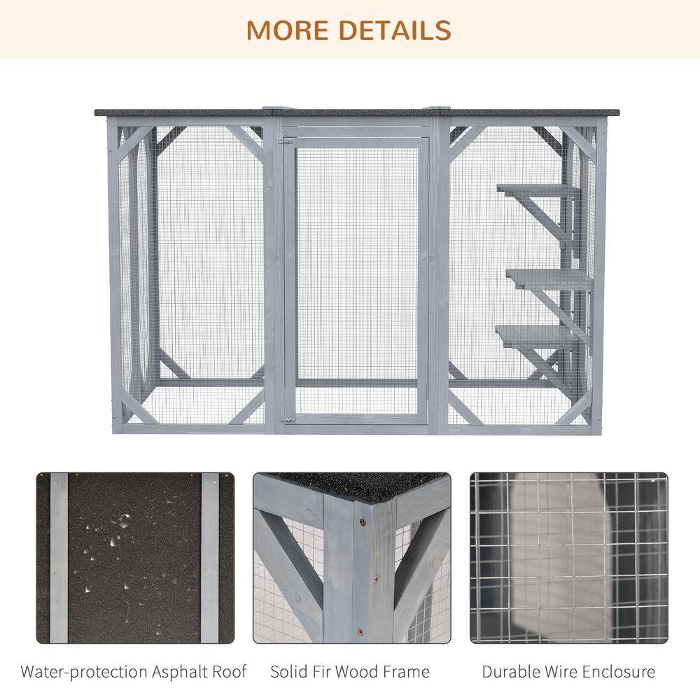 PawHut D32-002GY 71 in. L Grey Wooden Outdoor Cat House with Asphalt Roof. Multi-Level Platforms. and Large Enter Door