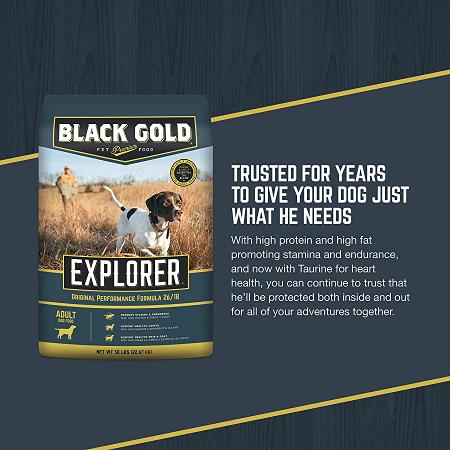 Black Gold Explorer Dry Dog Food for Adult Dogs. Original Performance 26/18 Formula. 50 lb Bag
