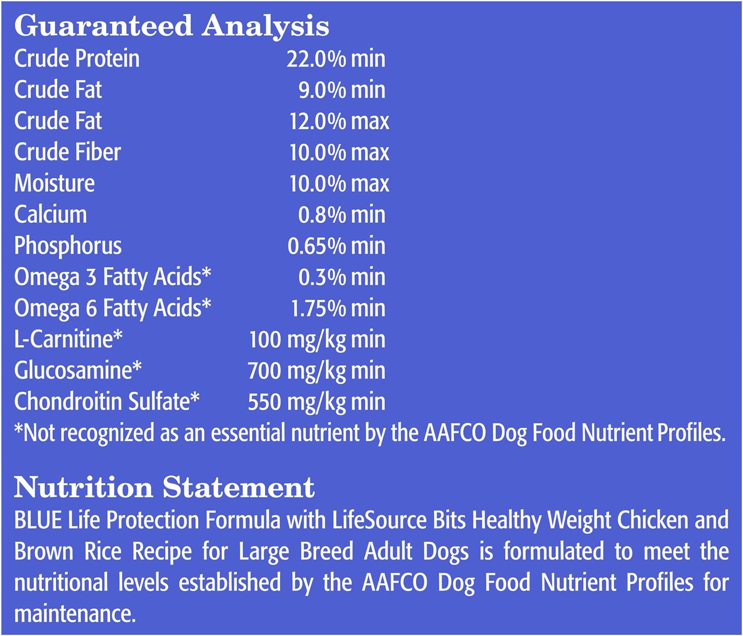 Blue Buffalo Blue Life Protection Formula Natural Adult Large Breed Healthy Weight Chicken and Brown Rice Dry Dog Food. 30 lbs.