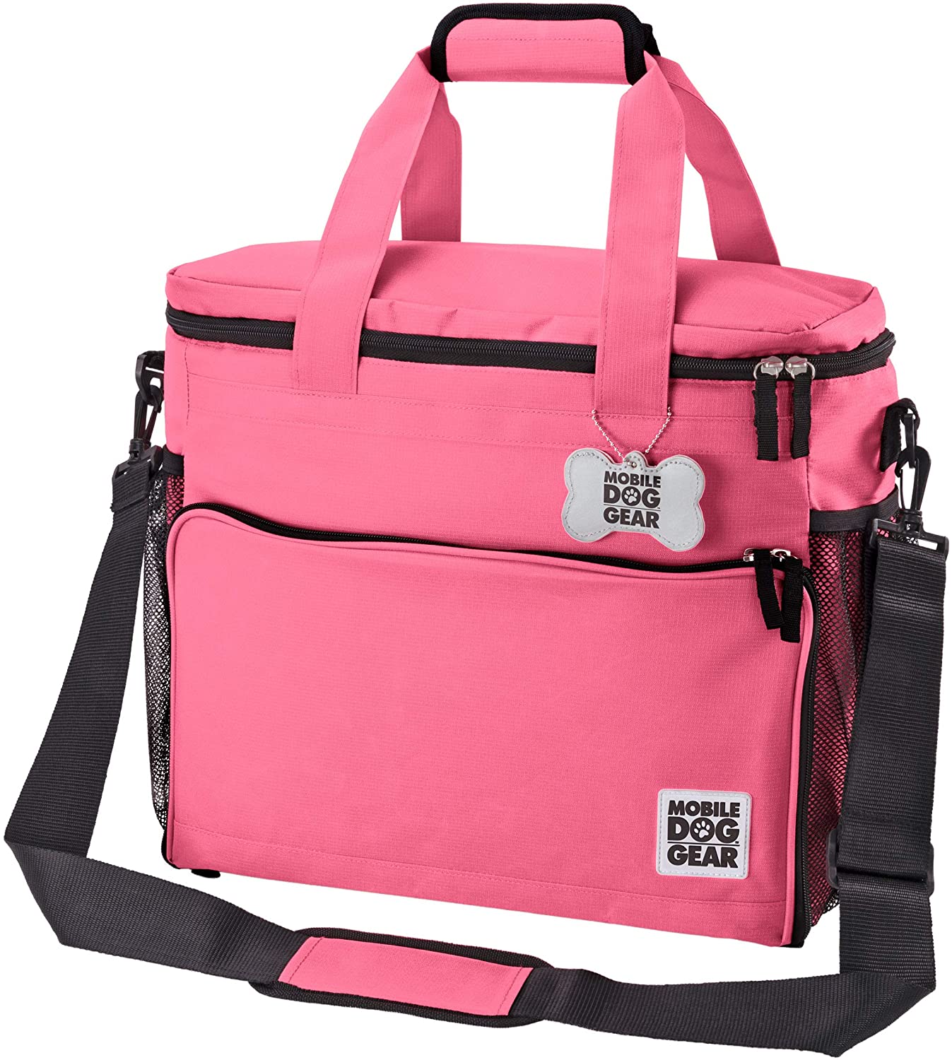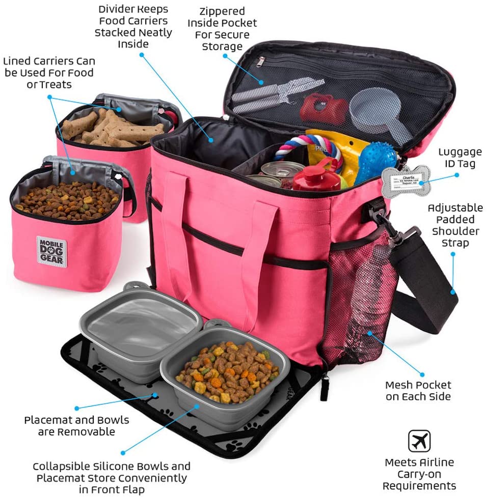 Mobile Dog Gear. Week Away Dog Travel Bag for Medium and Large Dogs. Includes Lined Food Carriers and 2 Collapsible Dog Bowl. Pink. Meets Airline Requirements
