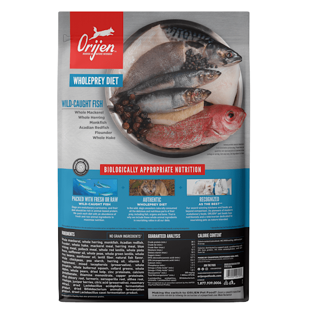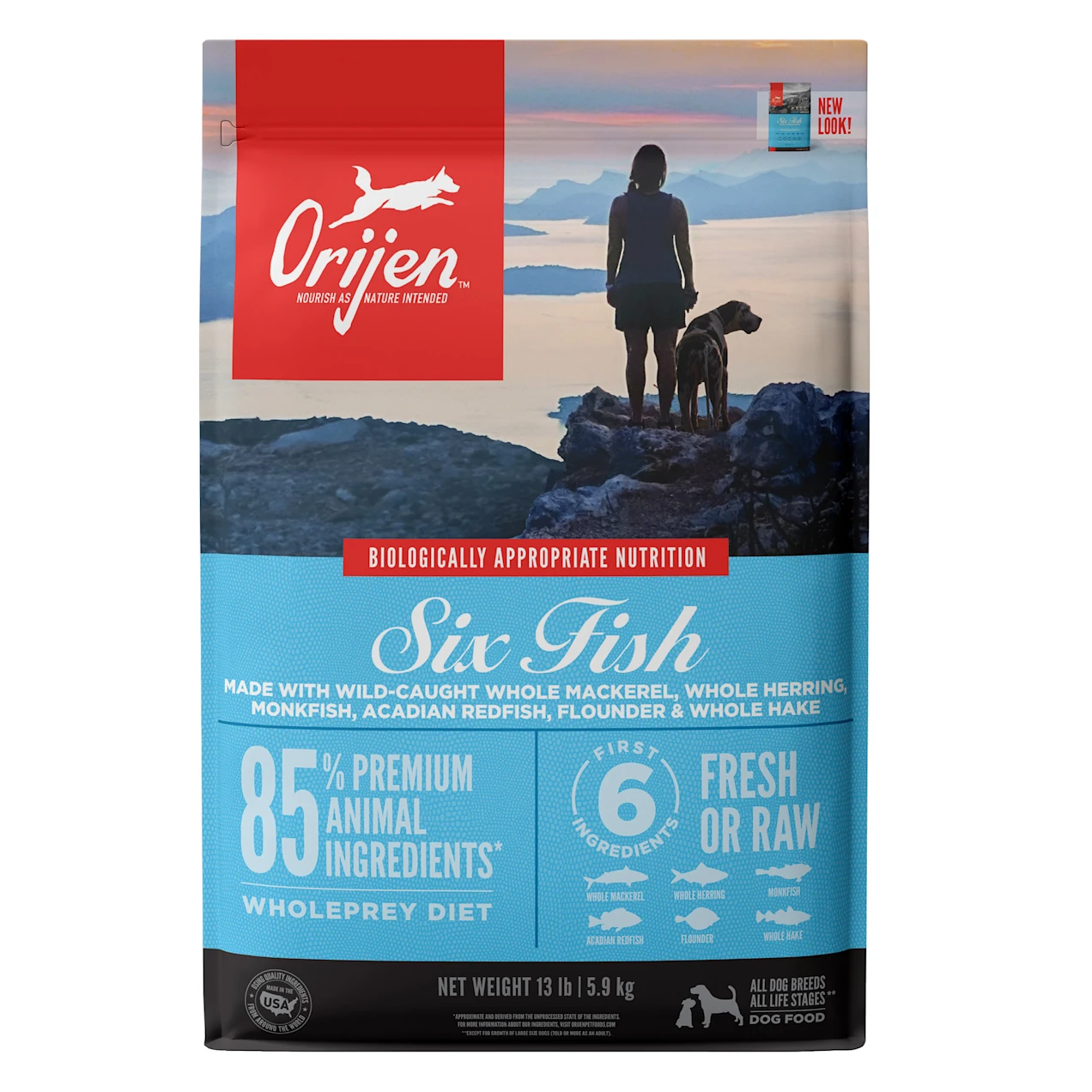 ORIJEN Six Fish Grain Free & Poultry Free High Protein Fresh & Raw Animal Ingredients Dry Dog Food. 13 lbs – 25 lbs.