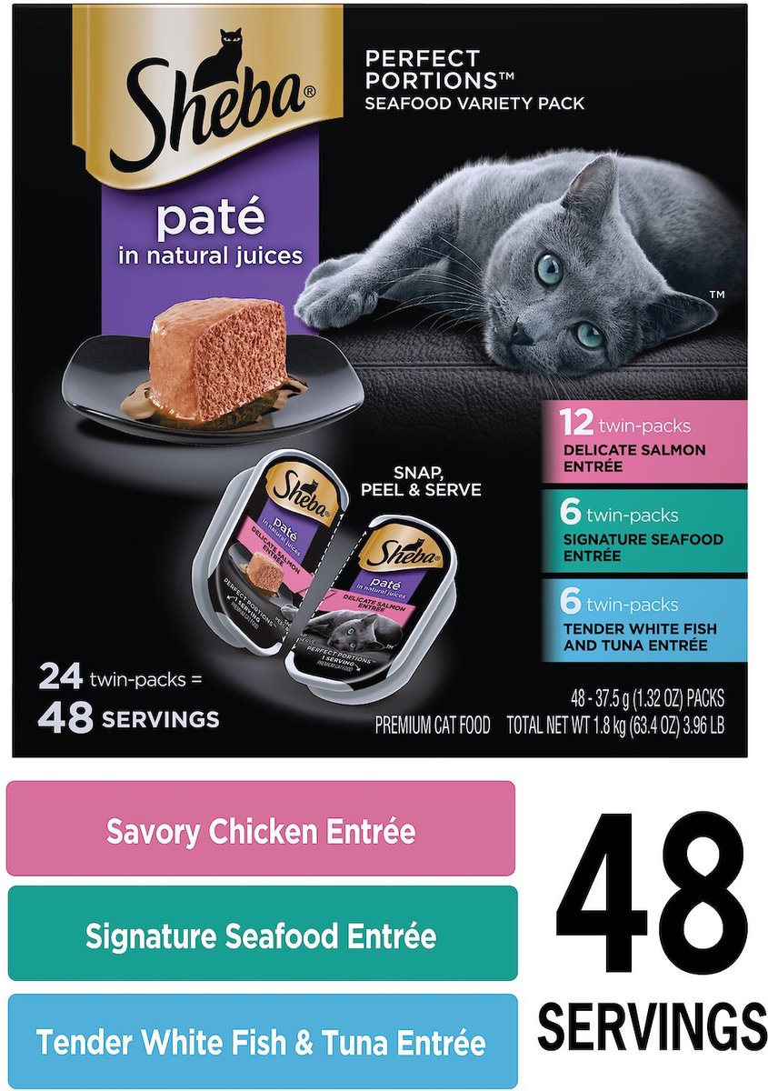 SHEBA Wet Cat Food Pate Variety Pack. Signature Seafood. Delicate Salmon and Tender Whitefish & Tuna Entrees. (24) 2.6 oz. PERFECT PORTIONS Twin-Pack Trays