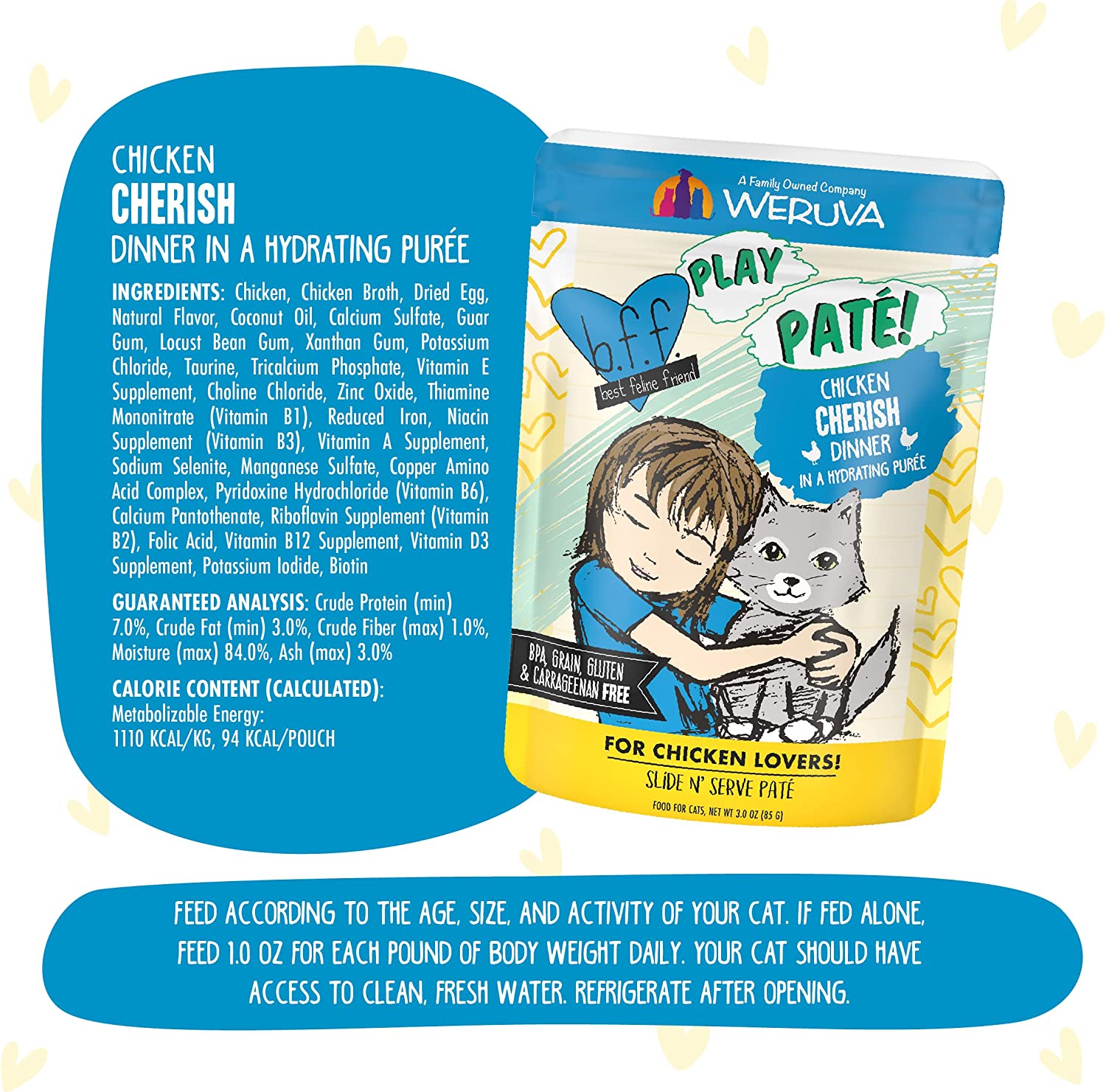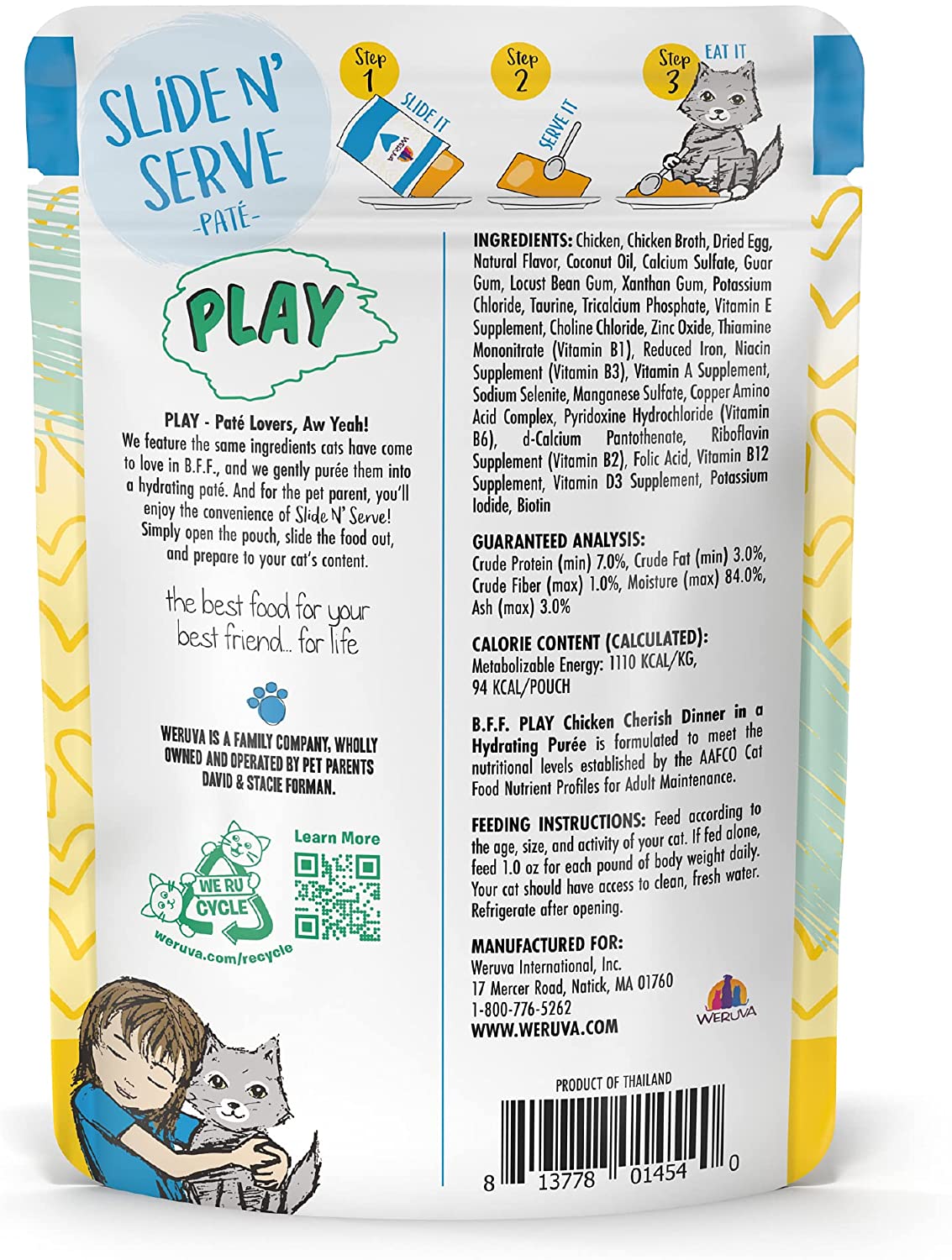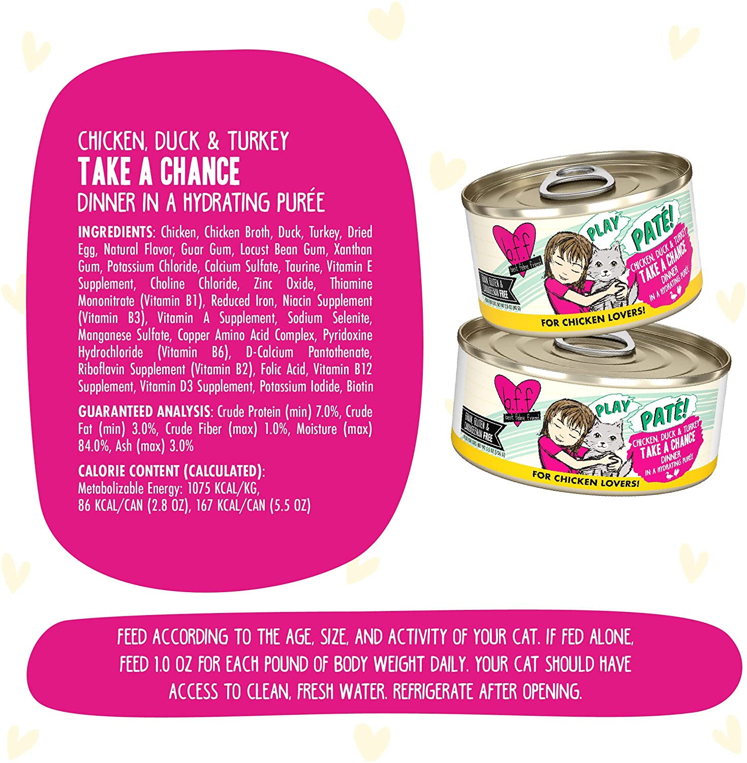 Weruva Wet Cat Food B.F.F. PLAY - Best Feline Friend Paté Lovers. Aw Yeah!. Chicken. Duck & Turkey Take a Chance with Chicken. Duck & Turkey. 2.8oz Can (Pack of 12)