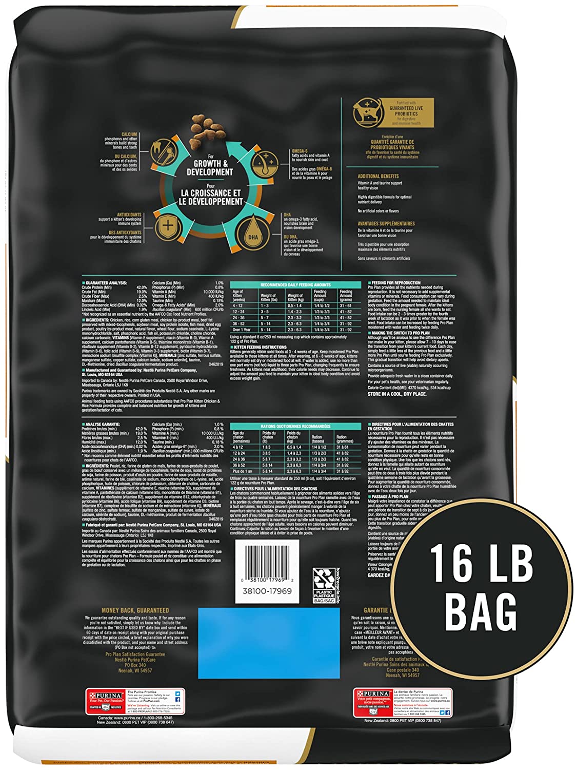 Purina Pro Plan With Probiotics. High Protein Dry Kitten Food. Chicken and Rice Formula - 16 lb. Bag