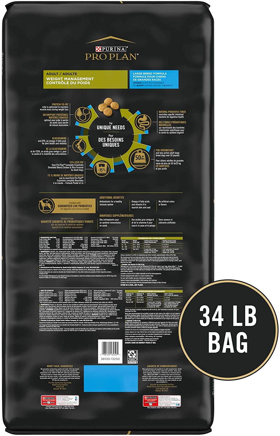 Purina Pro Plan Large Breed Weight Management Dry Dog Food. Chicken and Rice Formula - 34 lb. Bag
