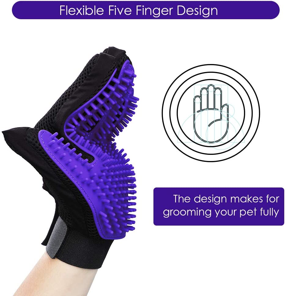 Pet Grooming Glove Purple - Gentle Deshedding Brush Glove - Efficient Pet Hair Remover Mitt - Enhanced Five Finger Design - Perfect for Dog and Cat with Long & Short Fur 1 Pair