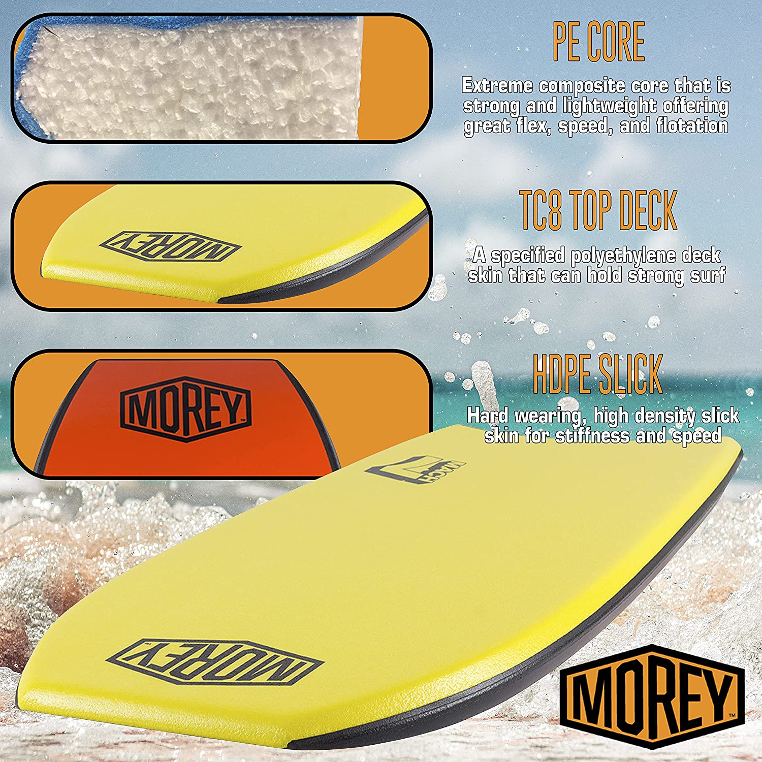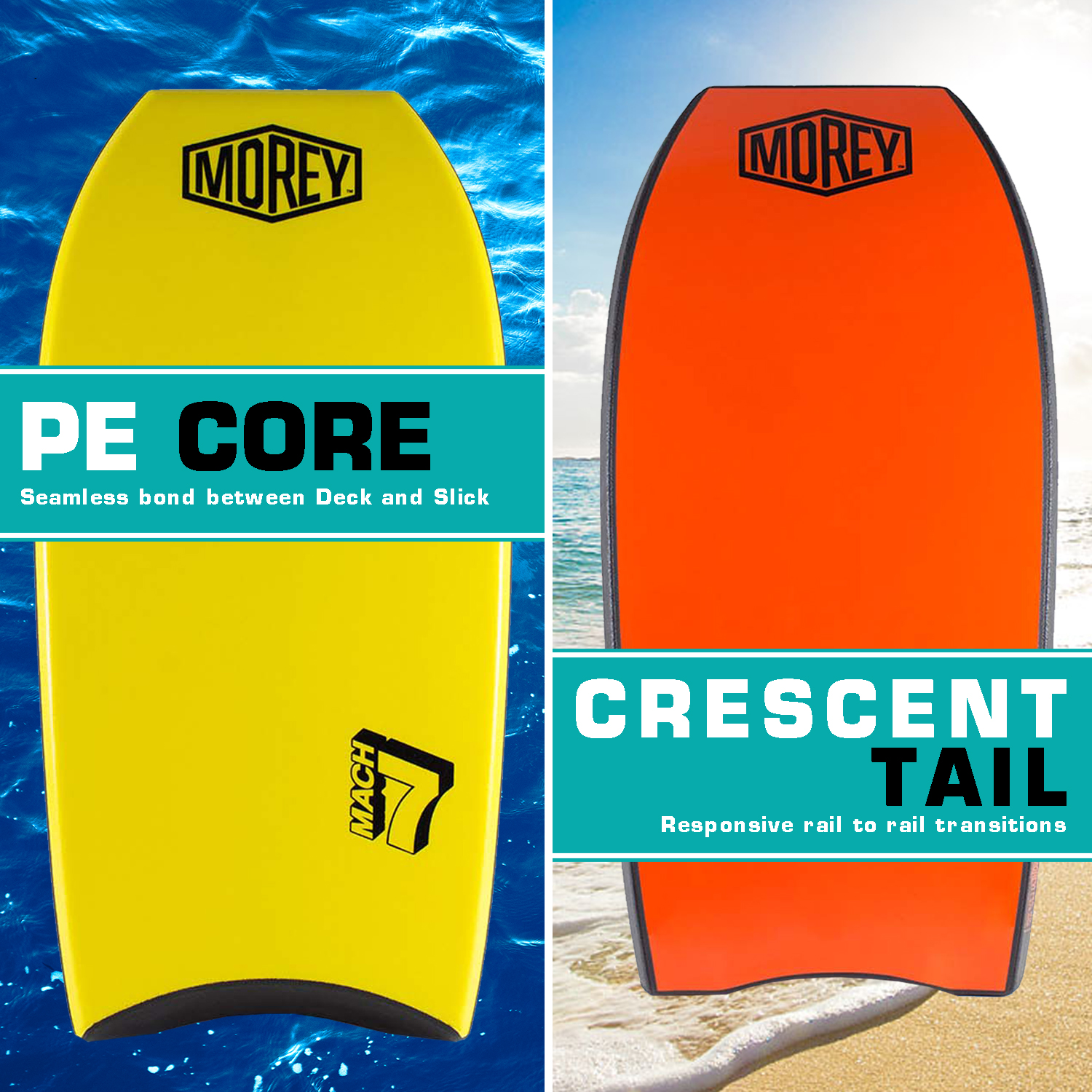 Morey Mach 7 Elite 42 Inch Bodyboard - PE Core. TC8 Deck. HDPE Slick. Single Power Rod Stringer. Crescent Tail. with Channels