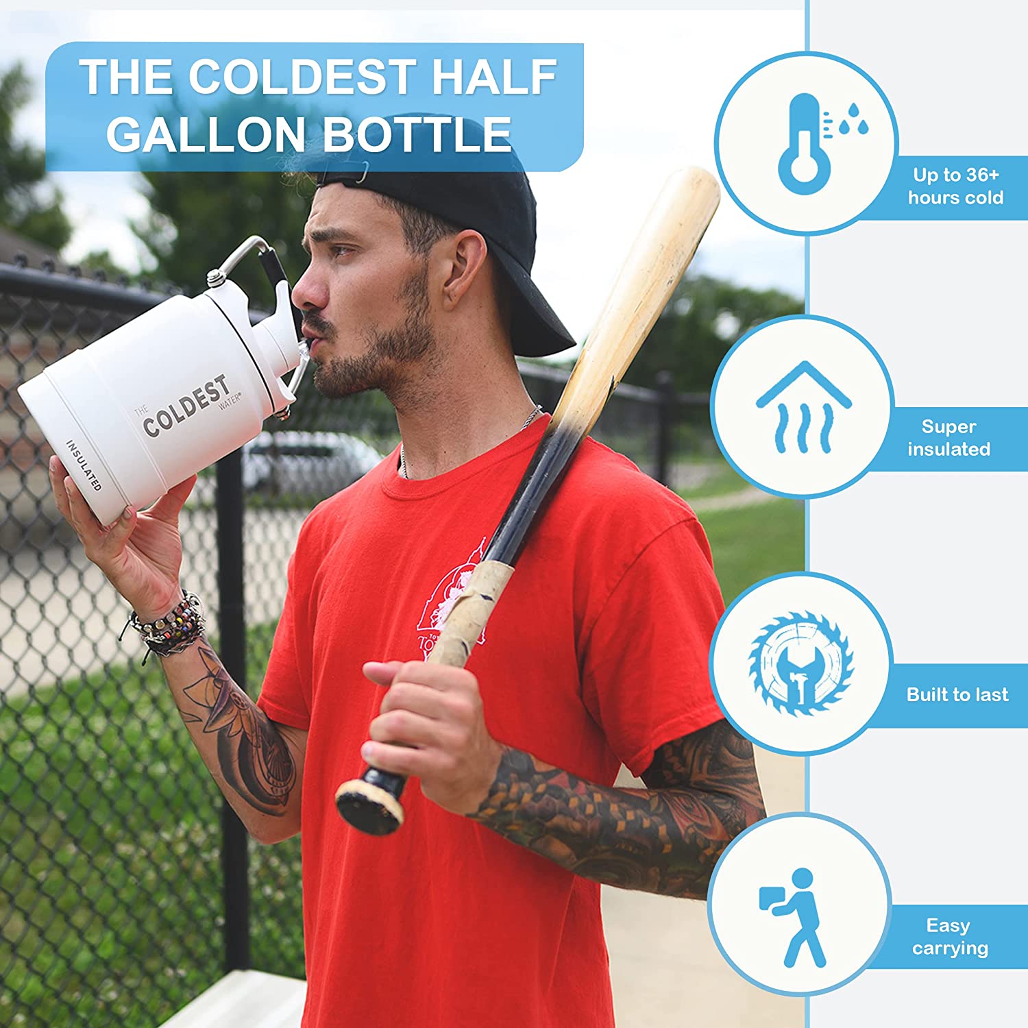 Coldest Sports Water Bottle - 1/2 Gallon (Straw Lid). Leak Proof. Vacuum Insulated Stainless Steel. Hot Cold. Double Walled. Thermo Mug. Metal Canteen (1/2 Gallon. White)