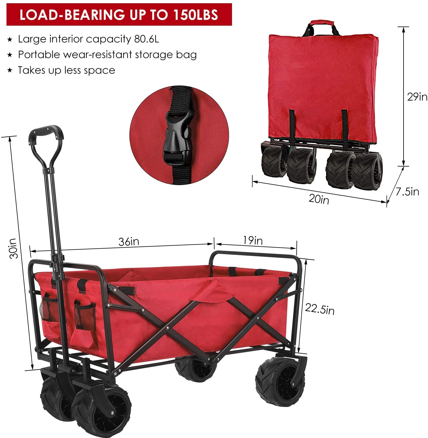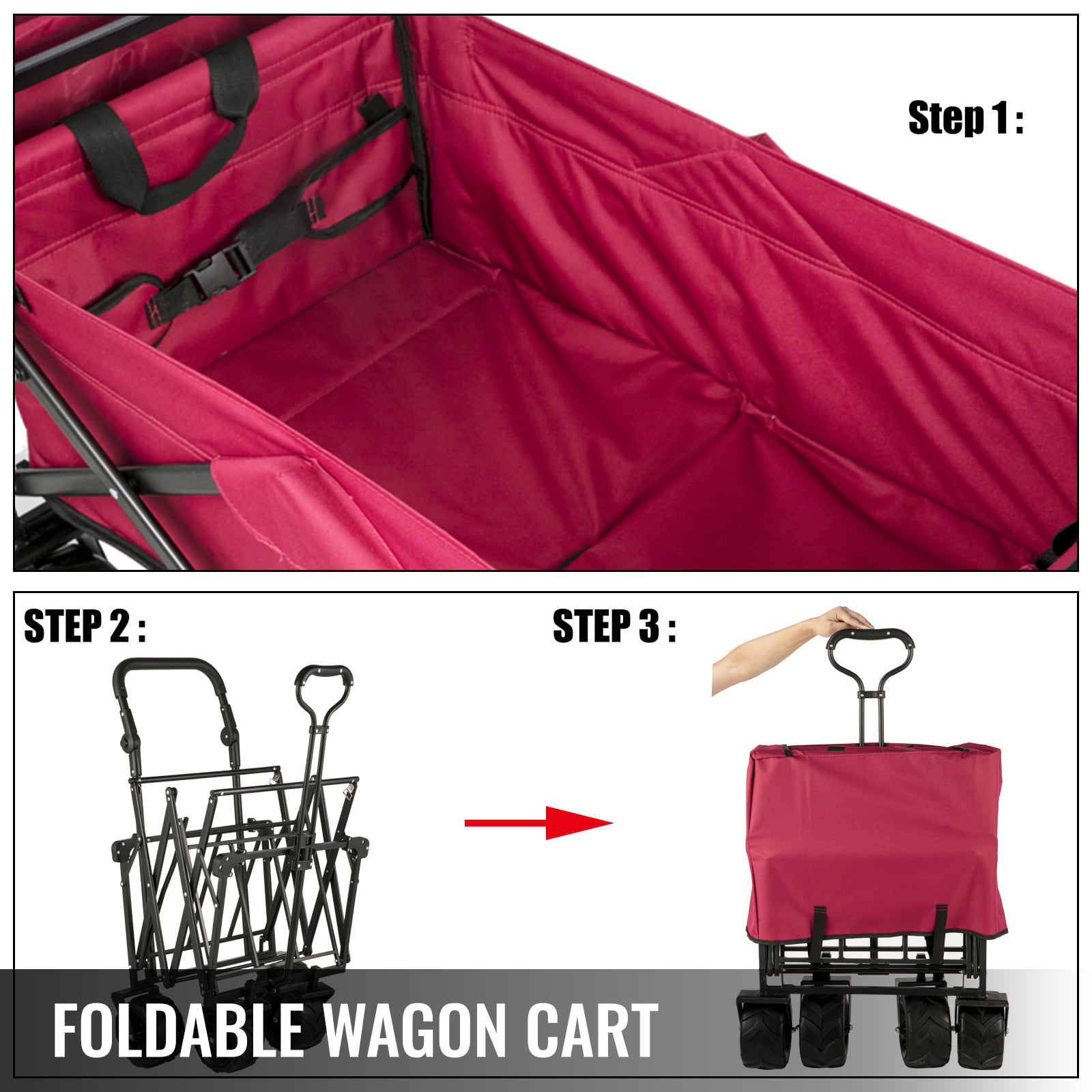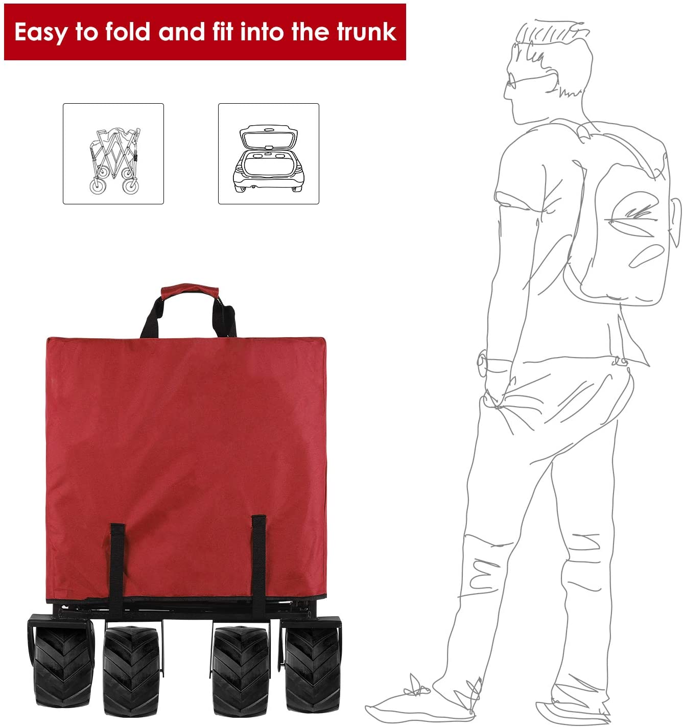 BAHOM Folding Collapsible Outdoor Utility Wagon Cart. Heavy Duty Garden Cart with All-Terrain Wheels and Carrying Bag .Red