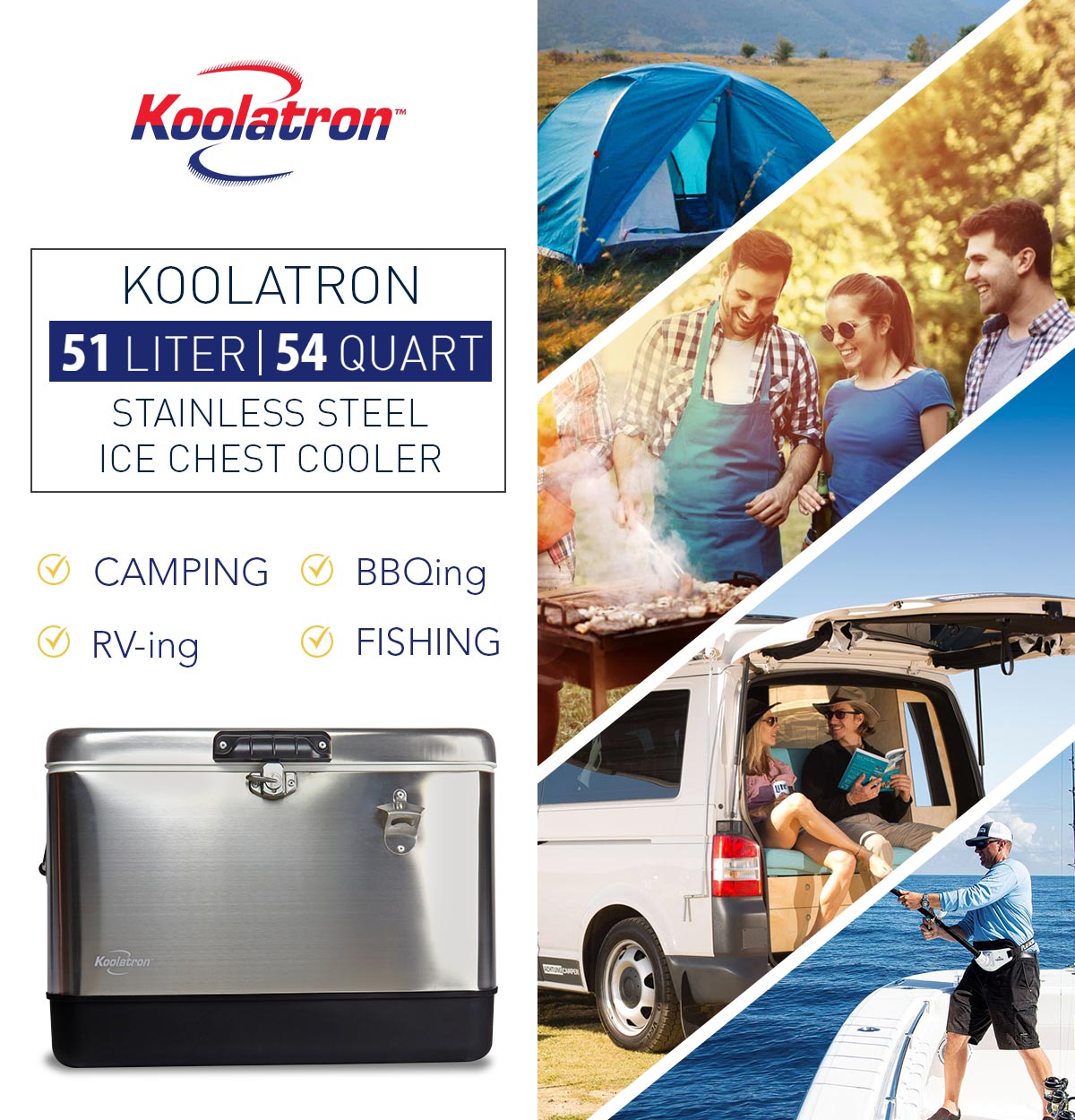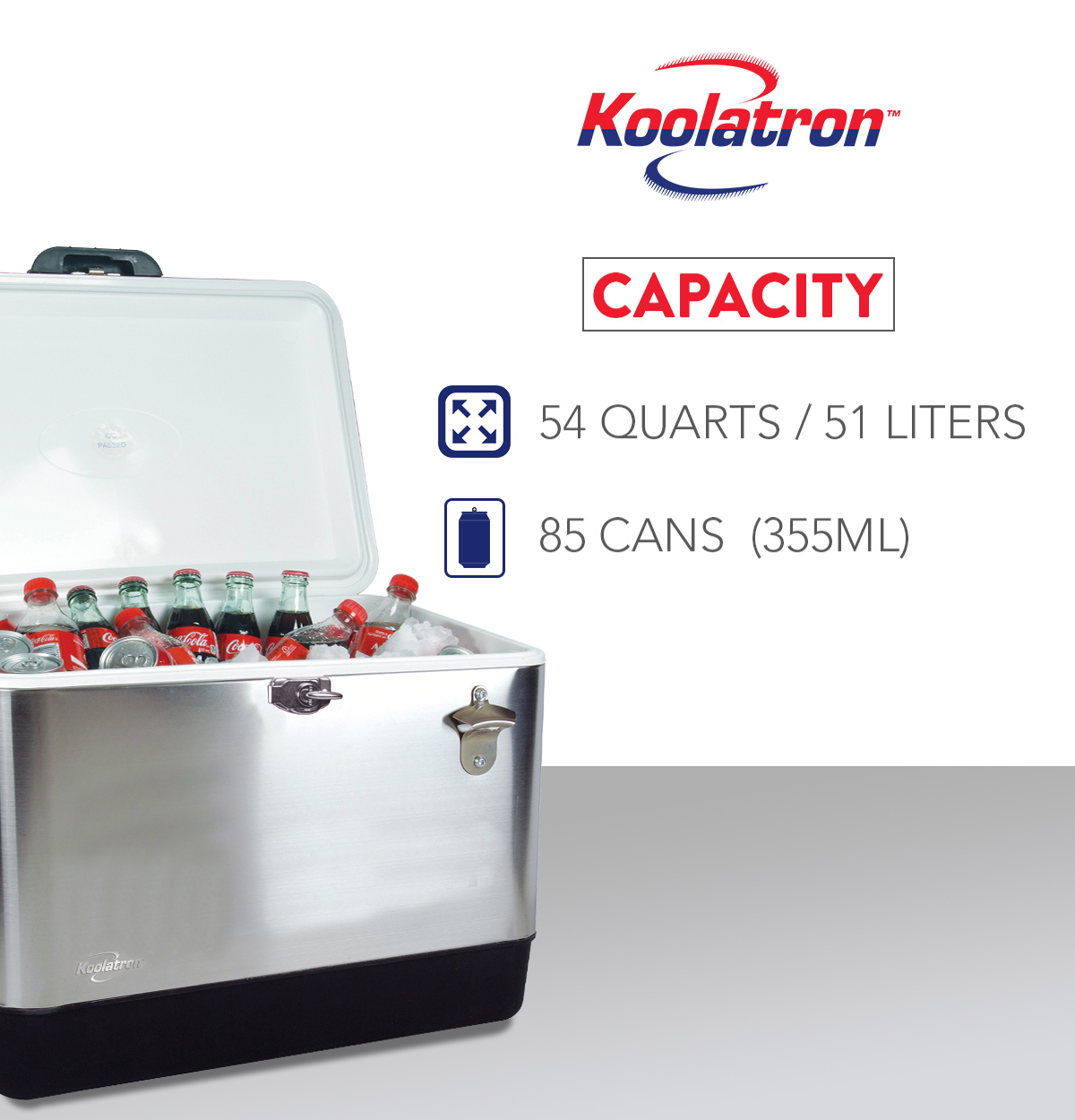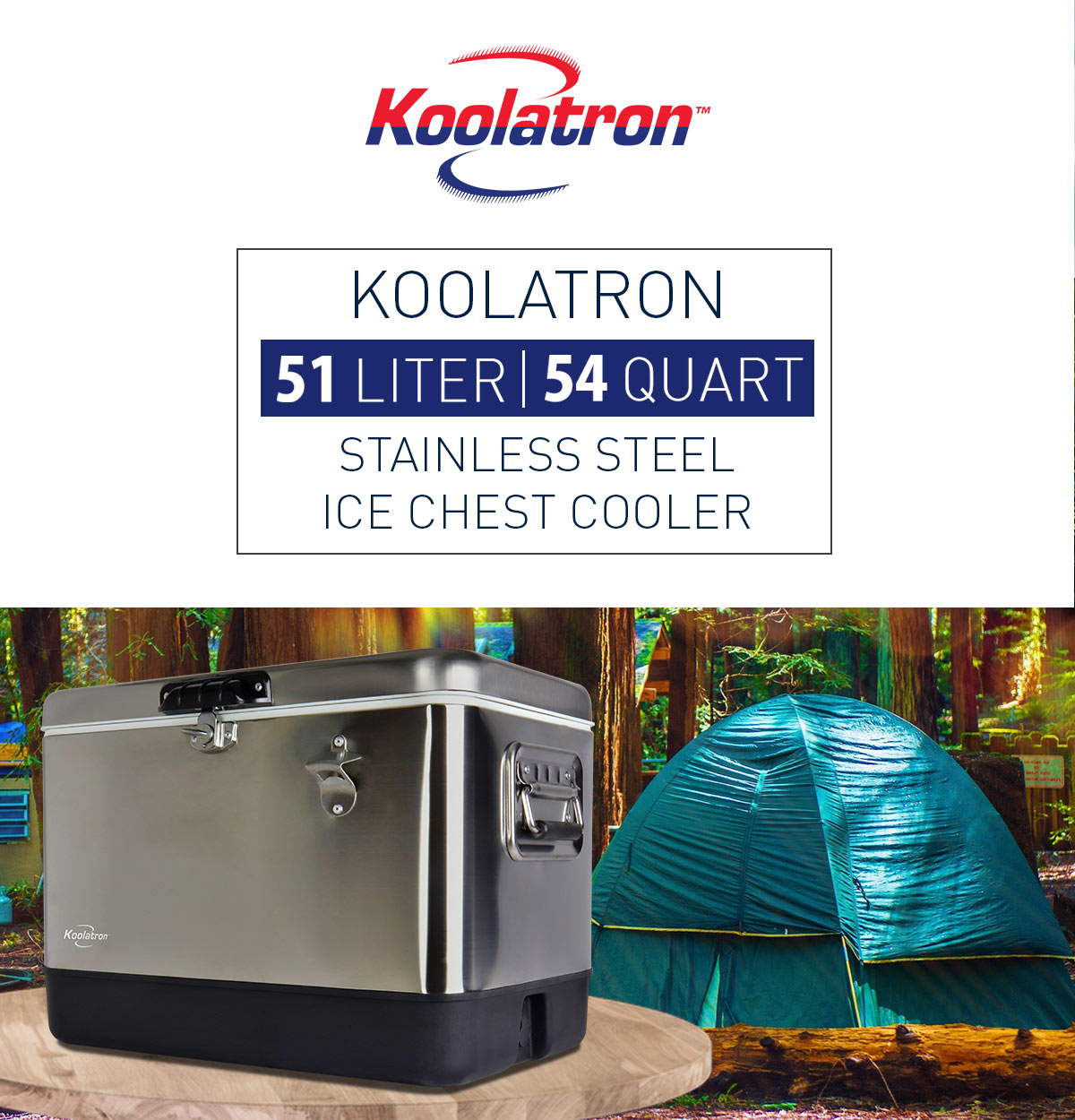 Koolatron Stainless Steel Ice Chest Beverage Cooler with Bottle Opener 51 L / 54 Quart 85 Can Capacity for Camping. Beach. RV. BBQs. Tailgating. Fishing