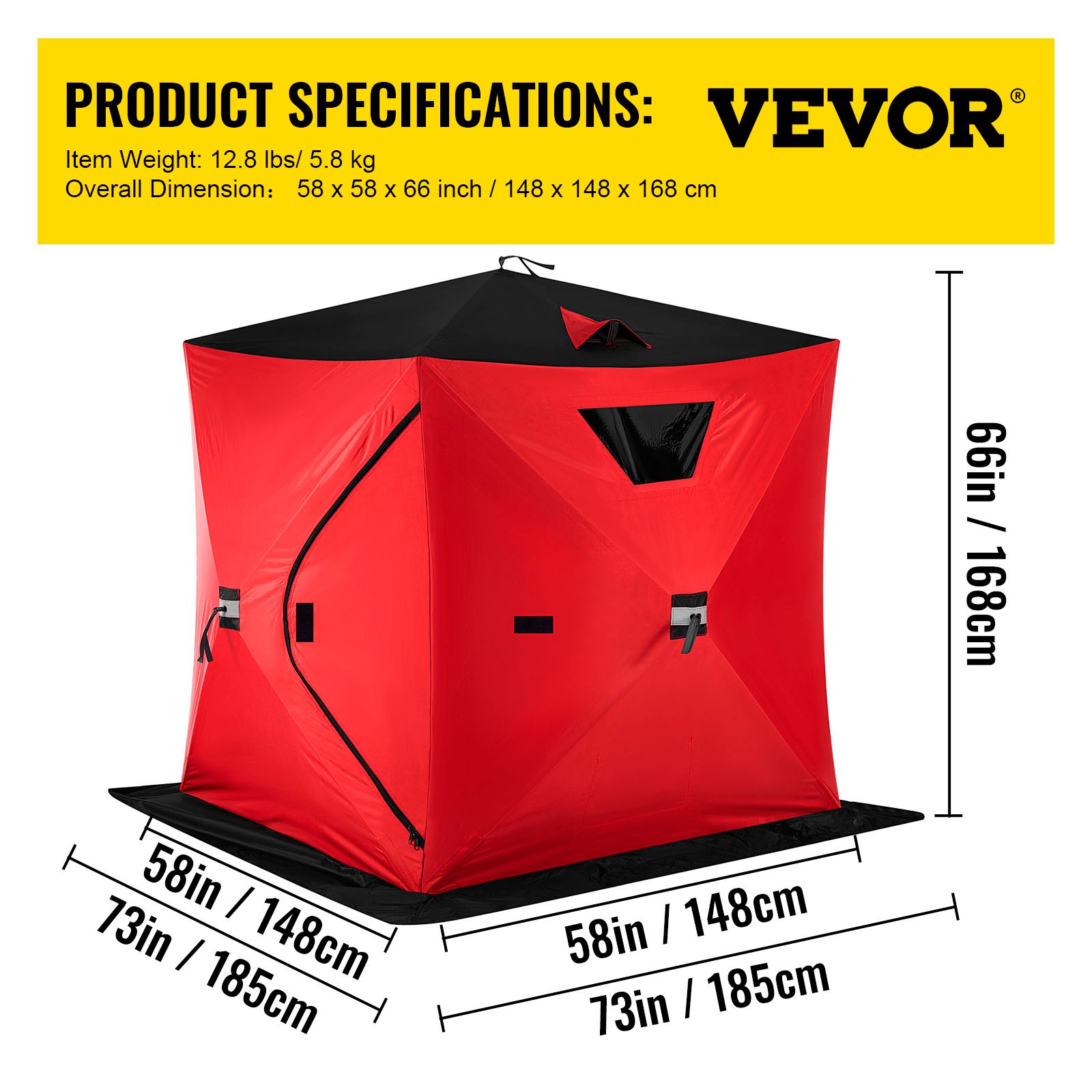 VEVORbrand Waterproof Pop-Up 2-Person Carrying Bag Ice Fishing Shelter with Detachable Ventilation Windows. 300D Oxford Fabric Zippered Door Shanty for Outdoor Fishing. Red