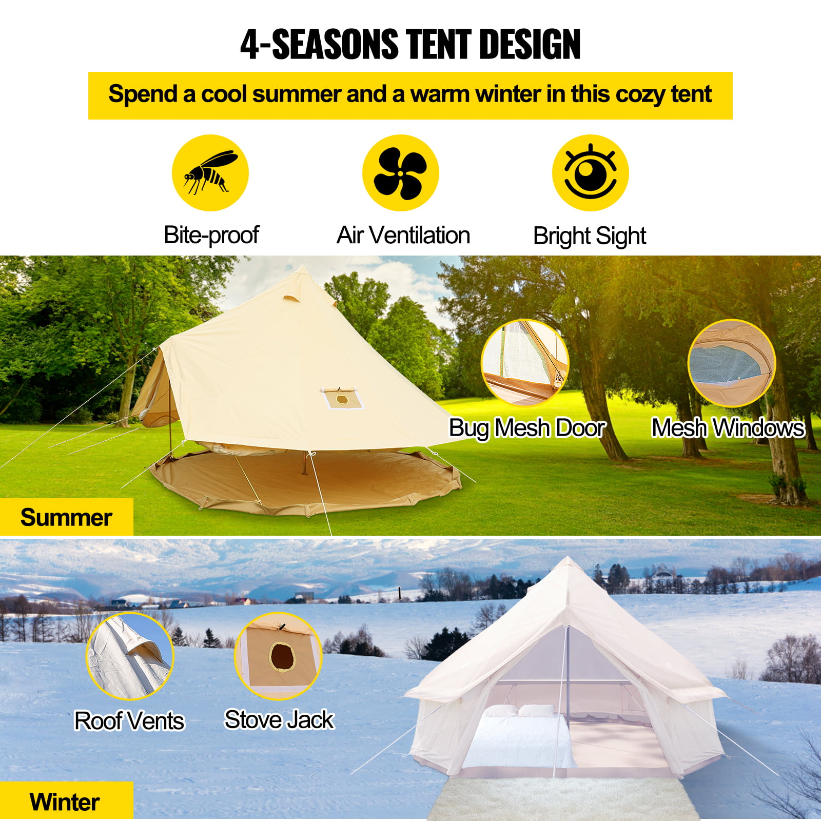 VEVORbrand Canvas Bell Tent 9.84ft Cotton Canvas Tent with Wall Stove Jacket Glamping Tent Waterproof Bell Tent for Family Camping Outdoor Hunting in 4 Seasons