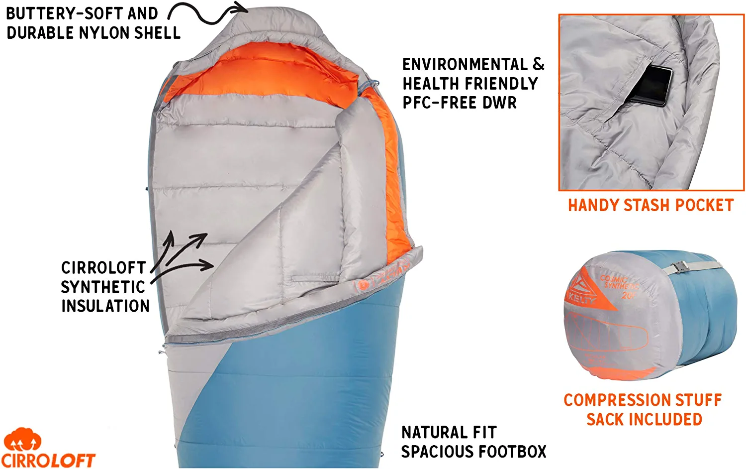 Kelty Cosmic Synthetic Fill 20 Degree Backpacking Sleeping Bag – Compression Straps. Stuff Sack Included. Regular. Tapestry Blue