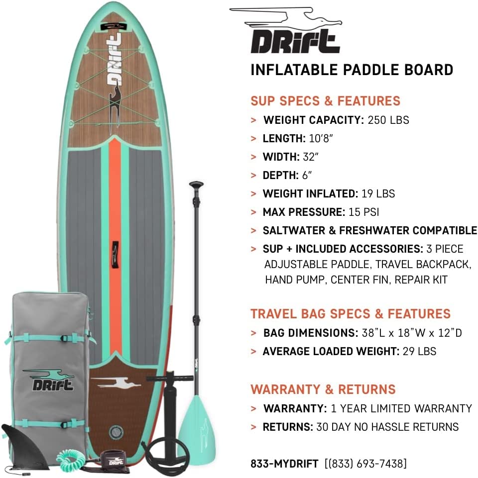 Drift Aero 10-8″ Inflatable Stand Up Paddle Board iSUP with Coiled Leash Pump Lightweight Paddle Fin & Backpack Travel Bag Adults Kids Family Friendly (Classic Woodgrain)