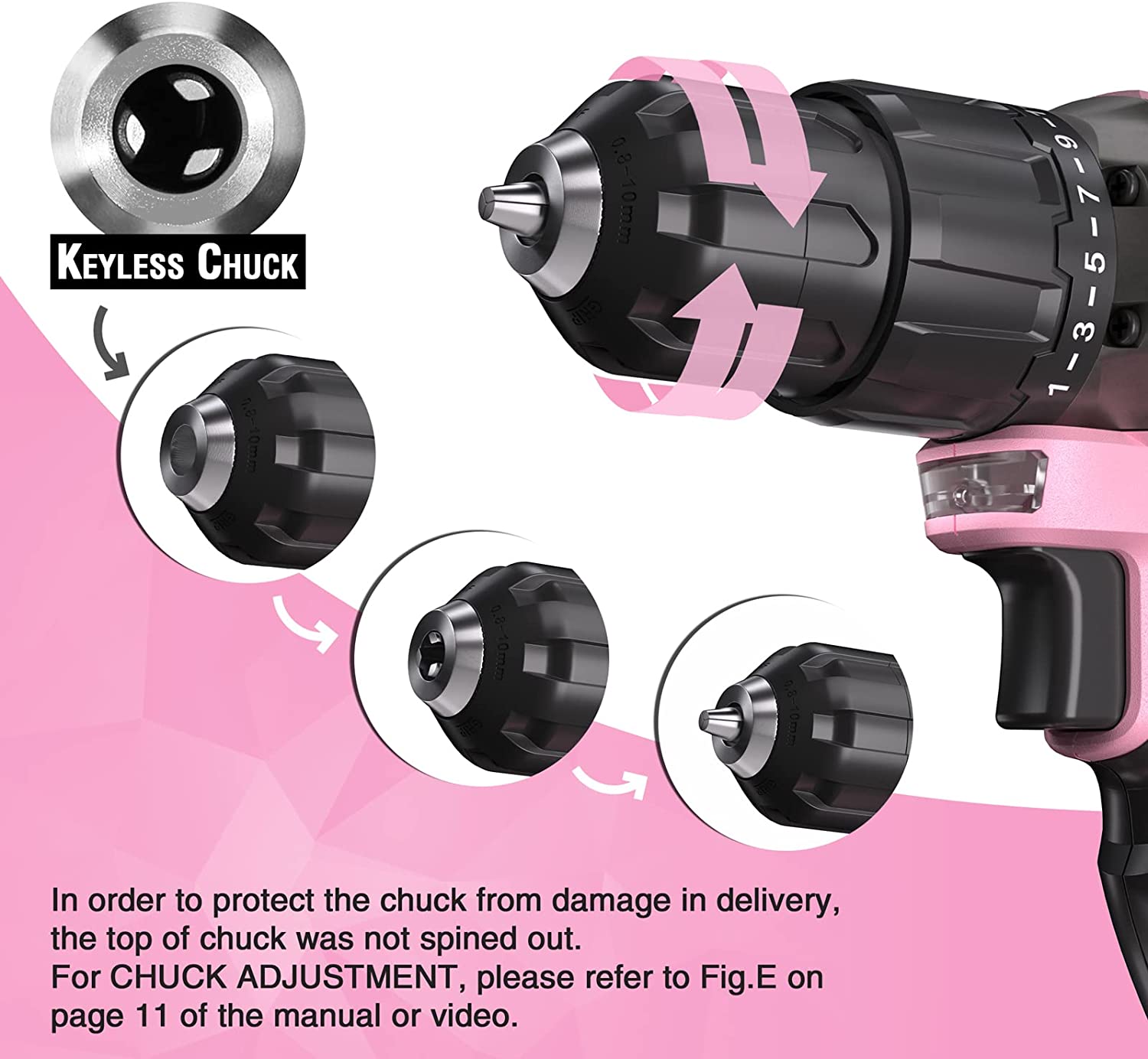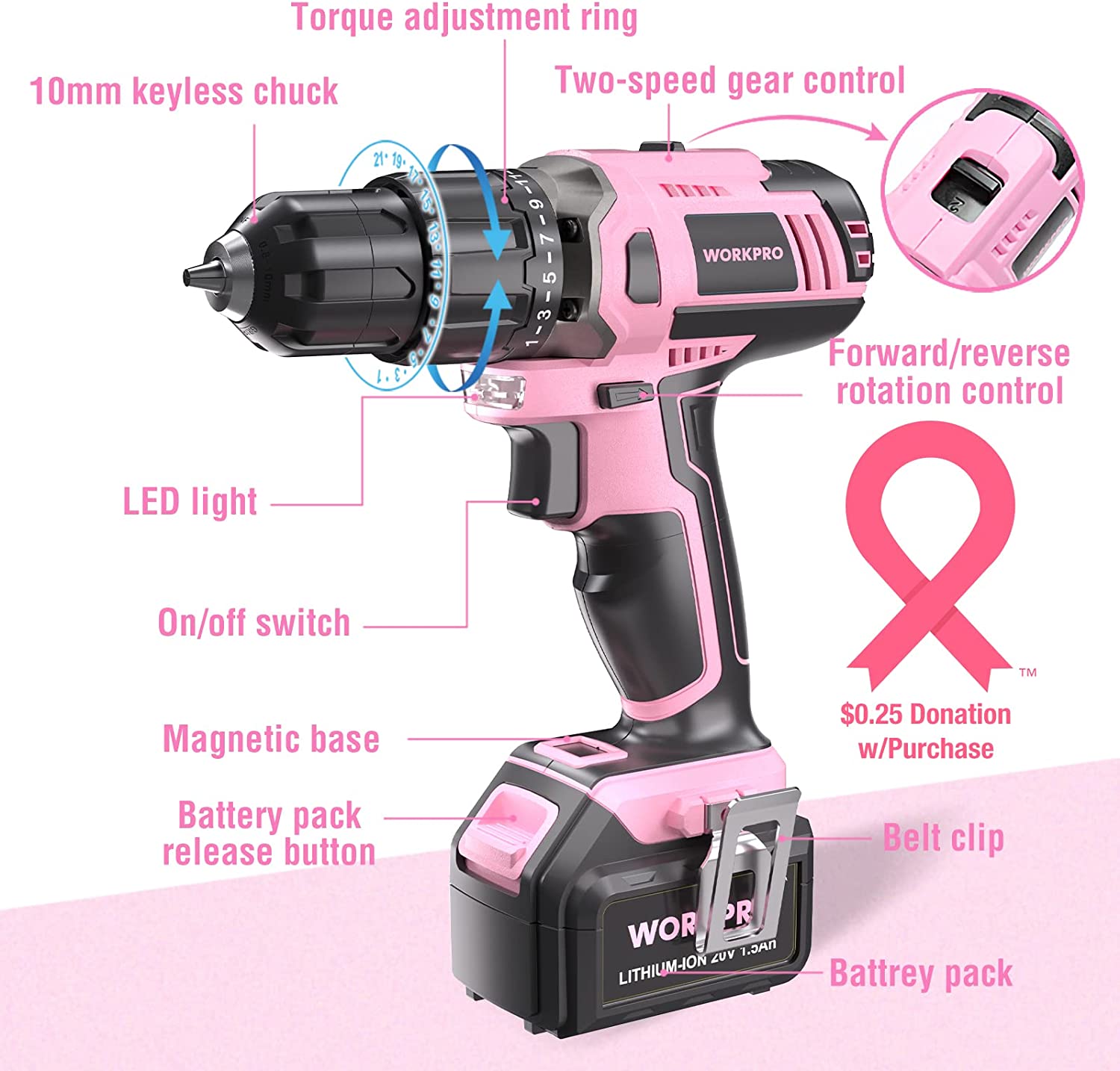WORKPRO W004532A Pink Cordless 20V Lithium-ion Drill Driver Set. 1 Battery. Charger and Storage Bag Included - Pink Ribbon