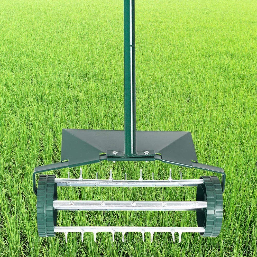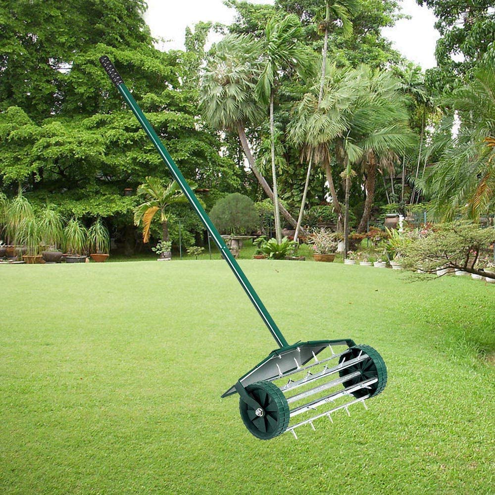 MTB Heavy Duty 18 Inch Aerator Roller Rolling Lawn Garden Spike with Fender Lawn Aerator Home Grass Steel Handle Green Quick and Easy to Assemble