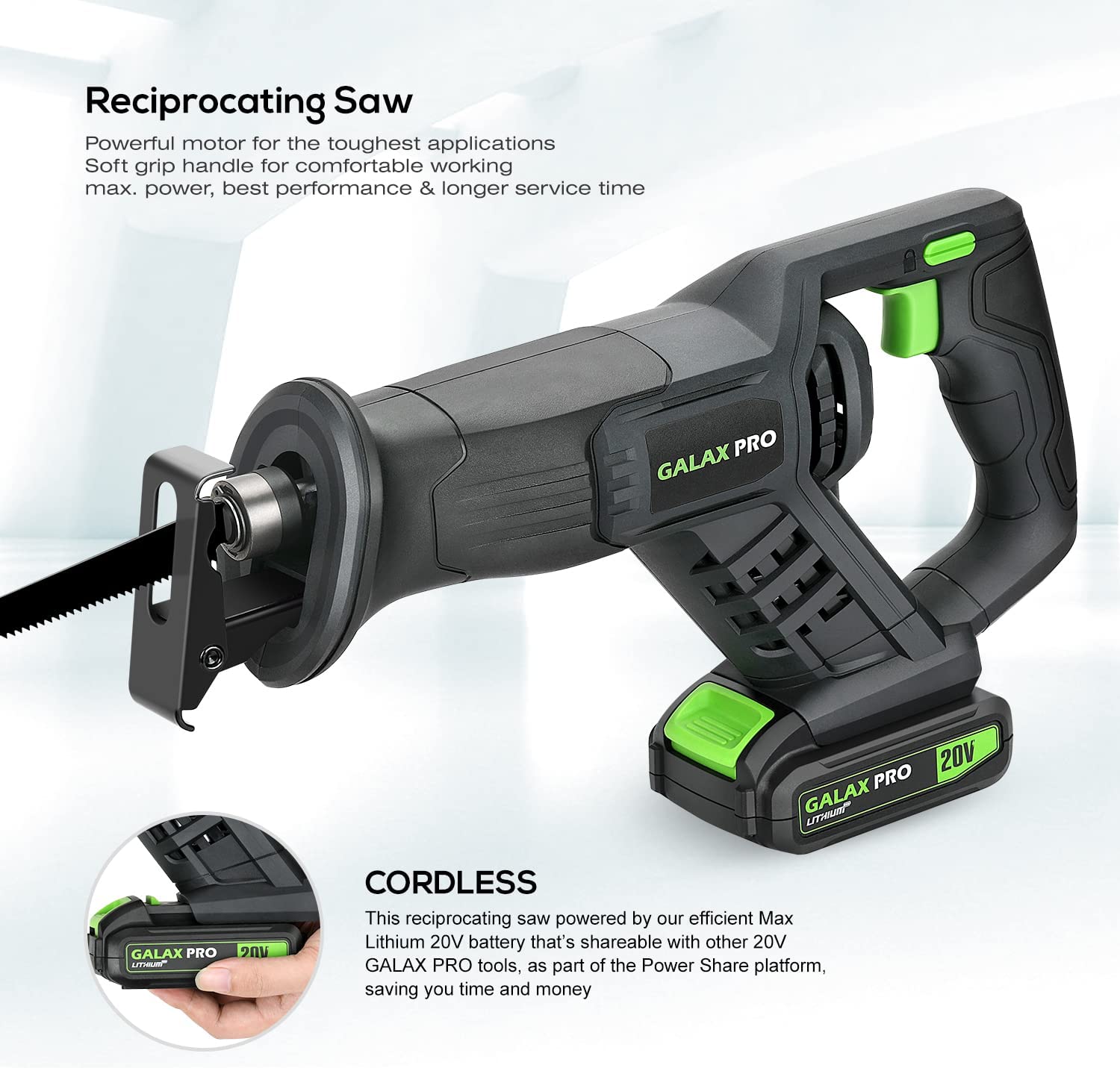 GALAX PRO Reciprocating Saw. Cordless Reciprocating Saw with battery. 20V 2.0Ah Cordless Saw. 3pcs 6-inch Wood Saw Blade & 2pcs 6-inch Metal Saw Blade