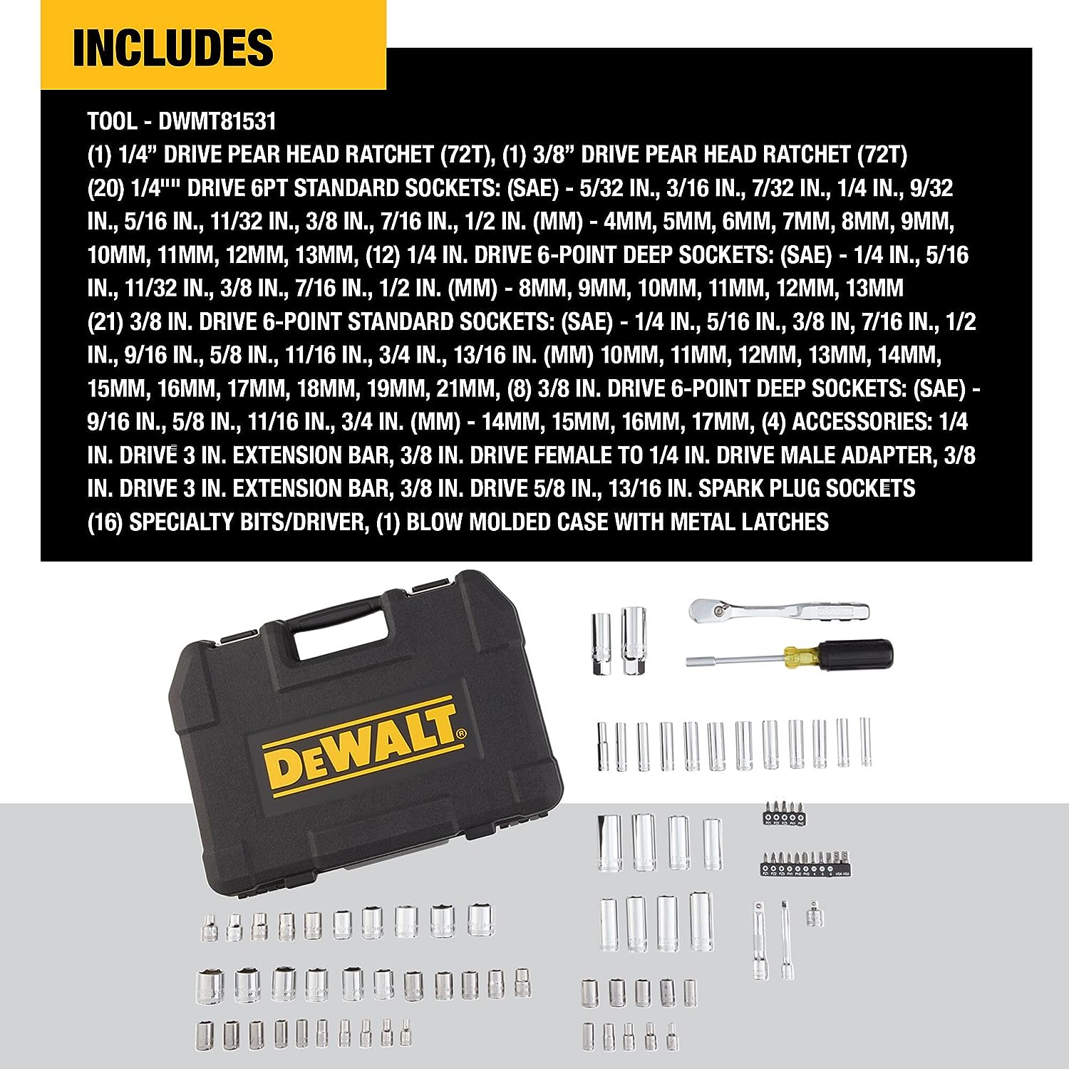 DEWALT Mechanic Tool Set. Includes Ratchets. Drill Bits and Anti-Slip Screwdriver. 84 Piece (DWMT81531)