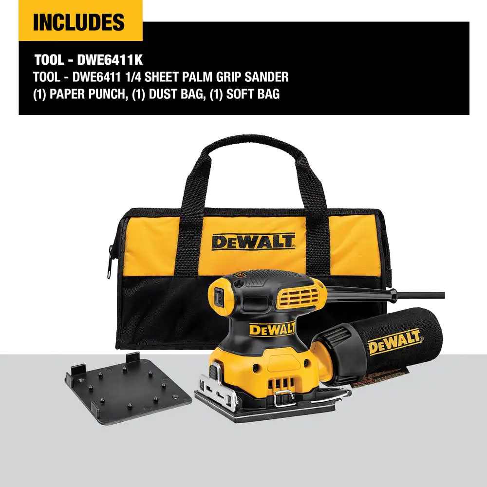 DEWALT DWE6411K 2.3 Amp Corded 1/4 Sheet Palm Grip Sander Kit with Contractor Bag