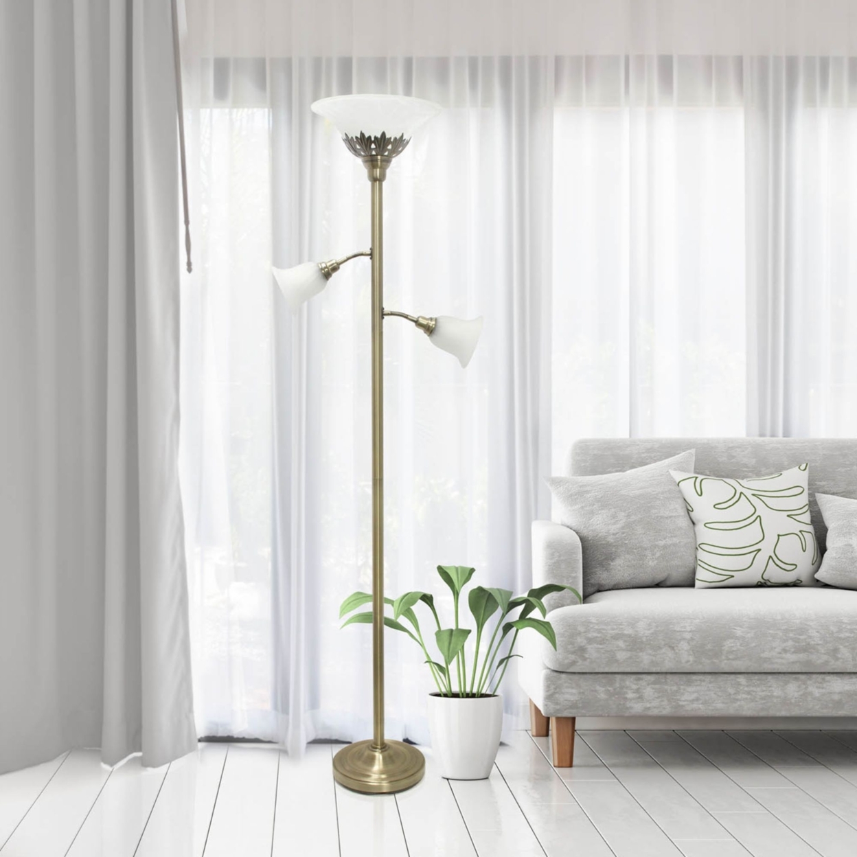 Elegant Designs 3 Light Floor Lamp with Scalloped Glass Shades. Antique Brass
