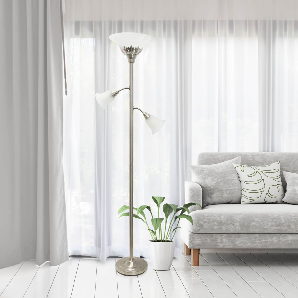 Elegant Designs 3 Light Floor Lamp with Scalloped Glass Shades. Brushed Nickel