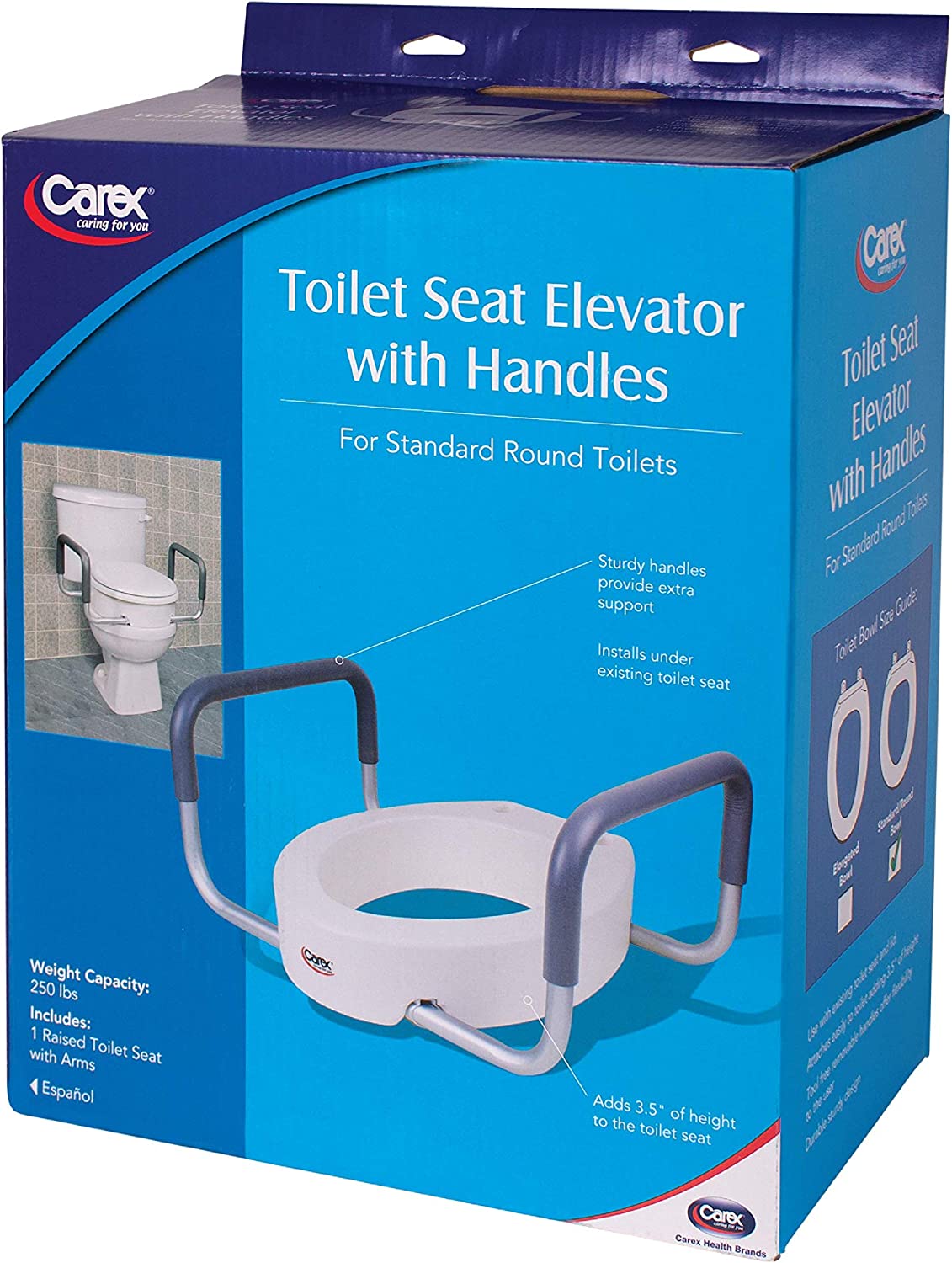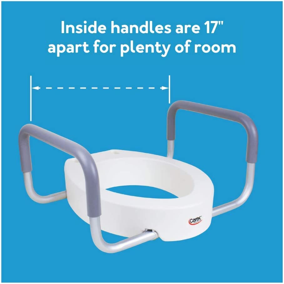 Carex 3.5 Inch Raised Toilet Seat with Arms - For Round Toilets - Elevated Toilet Riser with Removable Padded Handles. Easy On and Off. Support 250 lbs