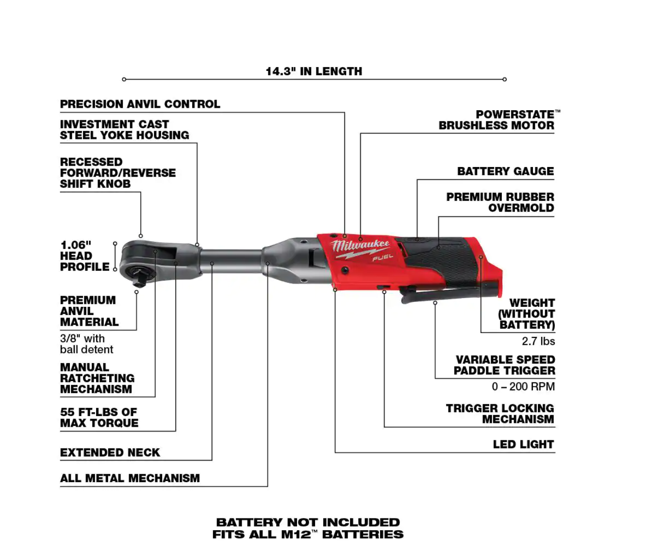 Milwaukee 2554-20-2560-20 M12 FUEL 12V Lithium-Ion Brushless Cordless Stubby 3/8 in. Impact Wrench with 3/8 in. Extended Reach Ratchet