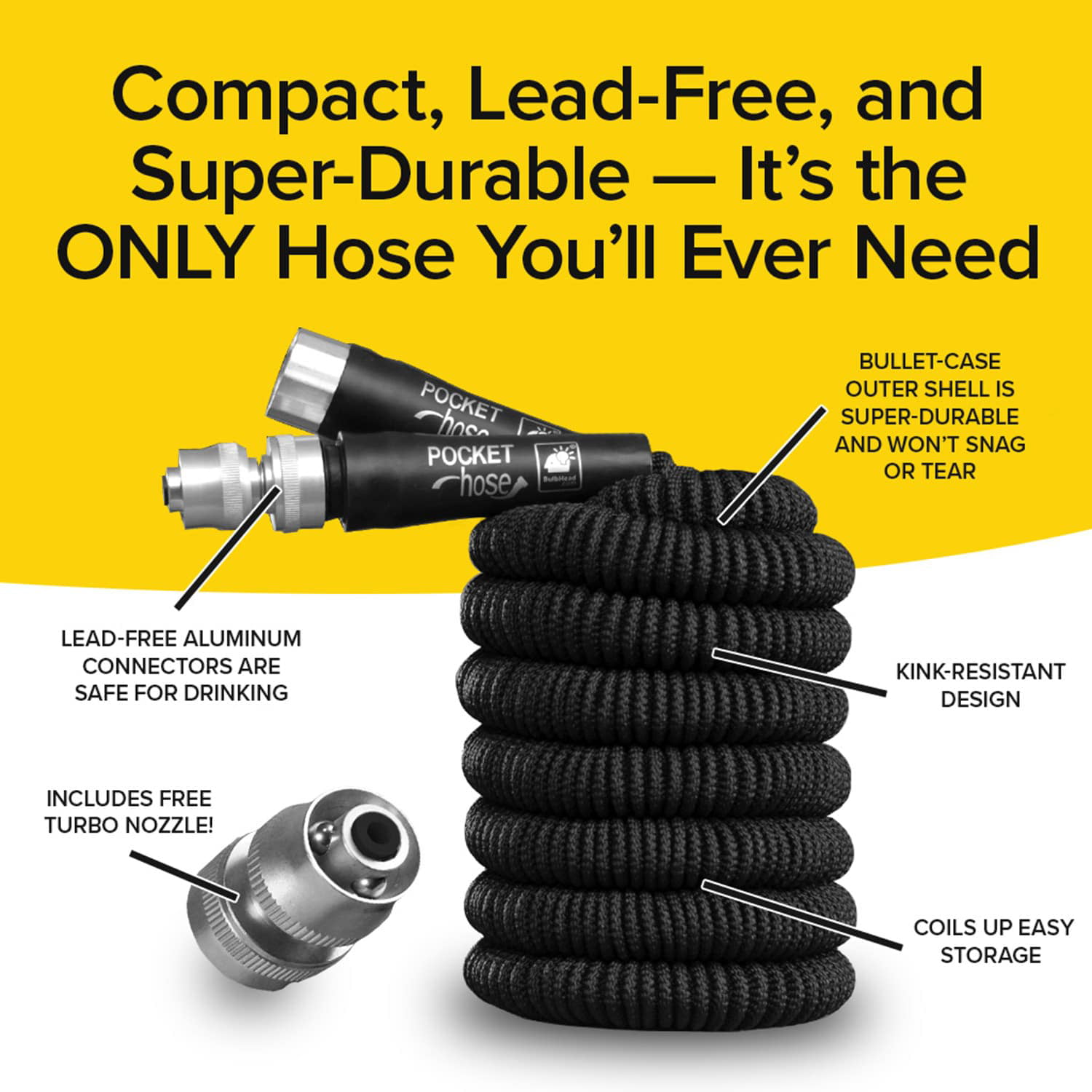 Pocket Hose Original Silver Bullet Water Hose by BulbHead - Expandable Garden Hose That Grows with Lead-Free Aluminum Connectors - Safe Drinking Water Hose (50 Feet)