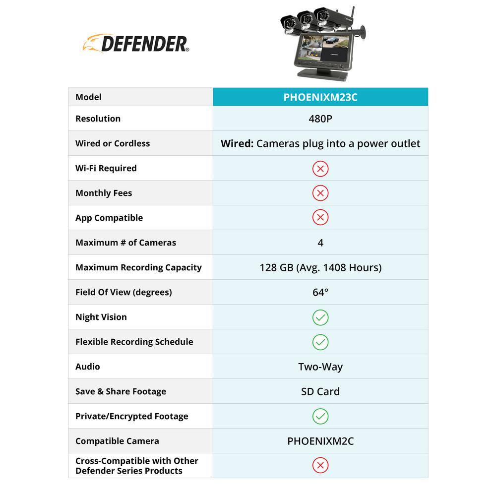Defender PHOENIXM23C PHOENIXM2 Non-Wi-Fi. Plug-In Power Security Camera System with 7″ Monitor SD Card Recording and 3 Night Vision Cameras